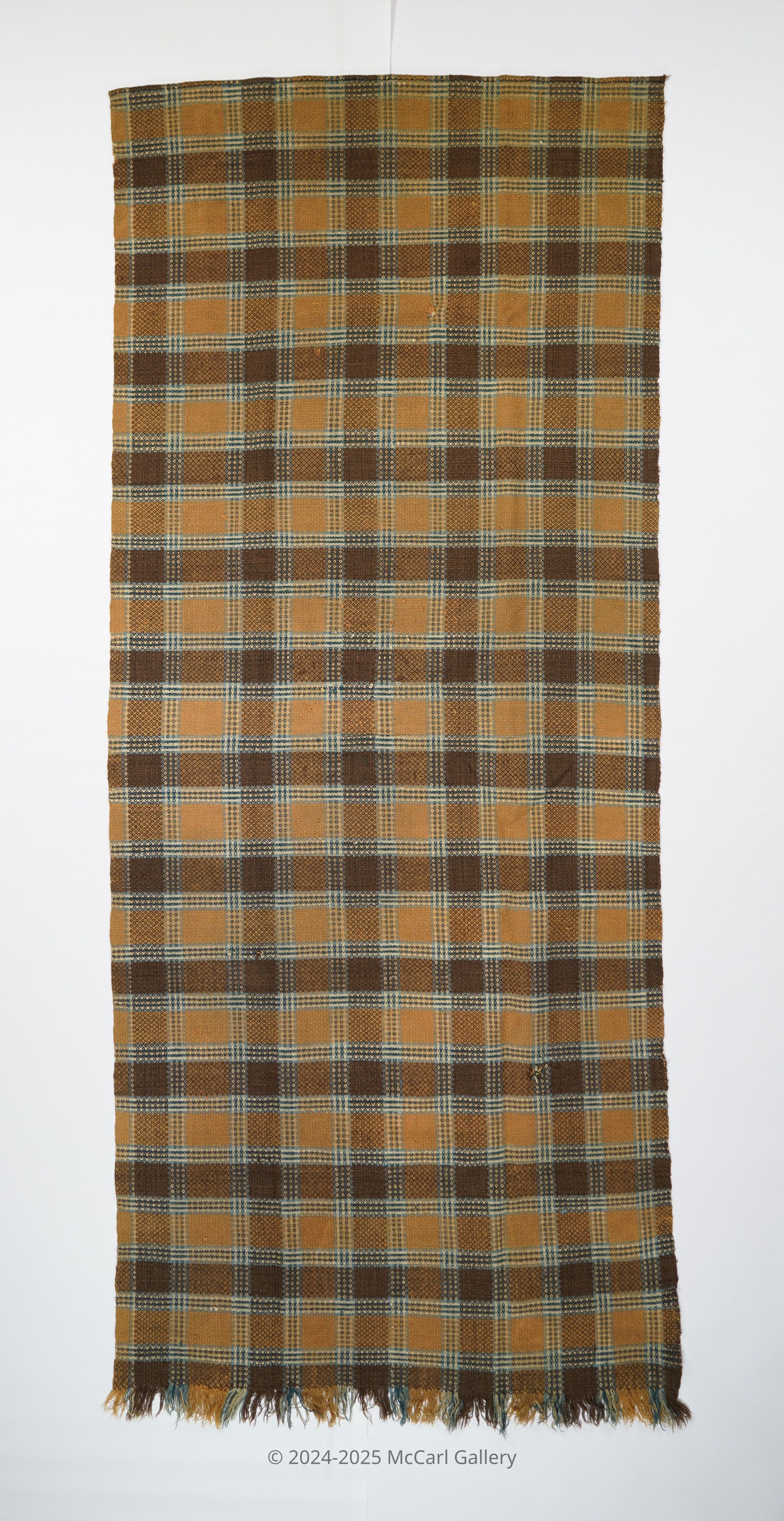 Blue, light blue, brown, yellow, and natural geometric twill coverlet with self-fringe along bottom. One panel.Collection