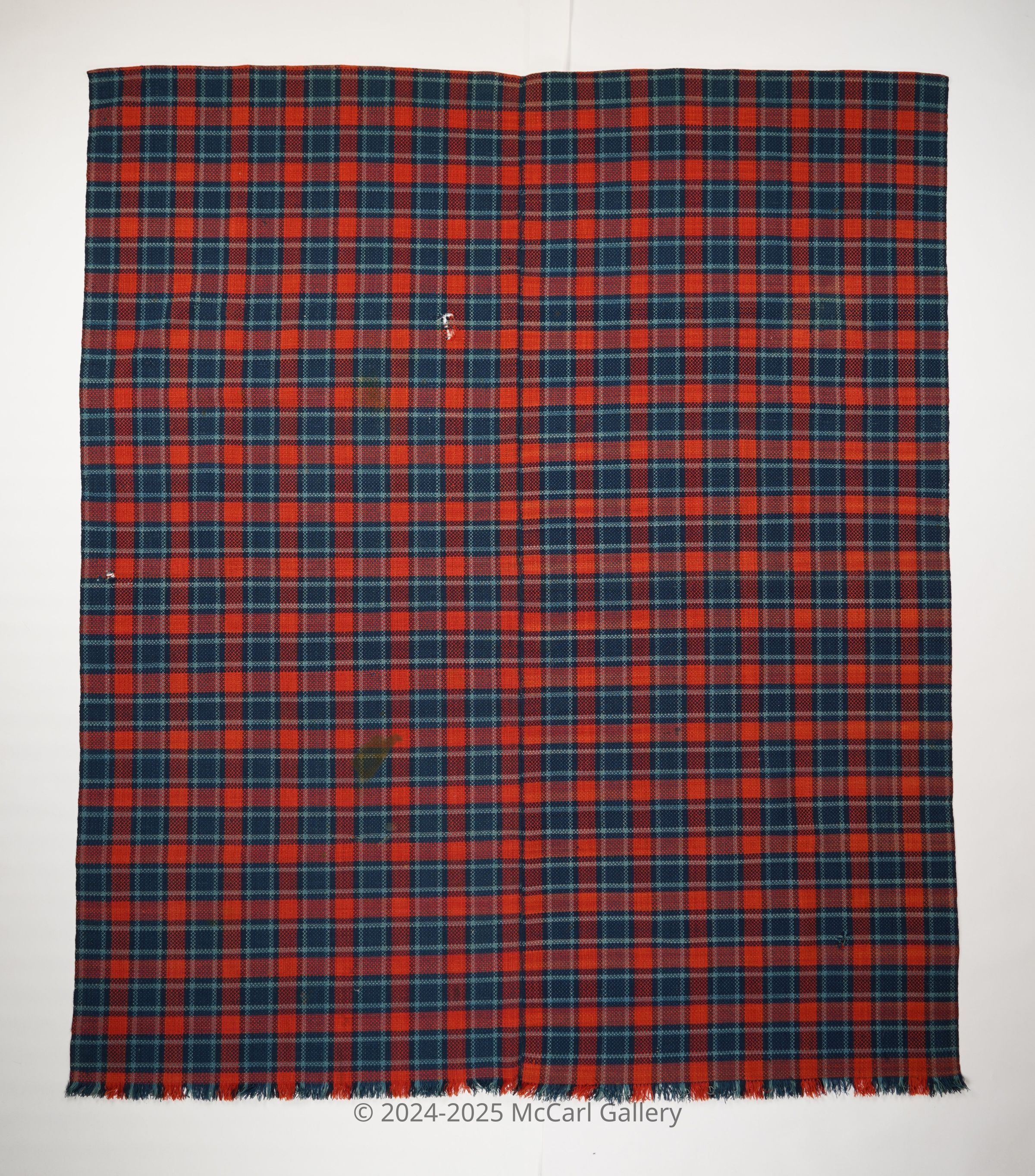 Red, blue, and navy geometric twill coverlet with self-fringe along bottom. Two joined panels.