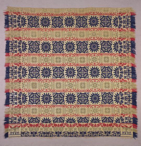 Figured coverlet; undyed and blue cotton and red, blue, and green wool, tied double cloth (Beiderwand). Hemmed at top, fringed on sides and bottom. Central motif is of quilt-like blocks in horizontal bands. Some rows contain blocks framed in square and circle shapes. At the center of each square is sixteen-pointed flower; at the center of each circle is an eight-pointed star surrounded by eight smaller stars. The other rows consist of alternating sunflower-like flowers and a block of four joined leavles framed by a curving octagon pattern. Border has a rose bush motif. Corner blocks contain an eagle motif and the woven text.Collection