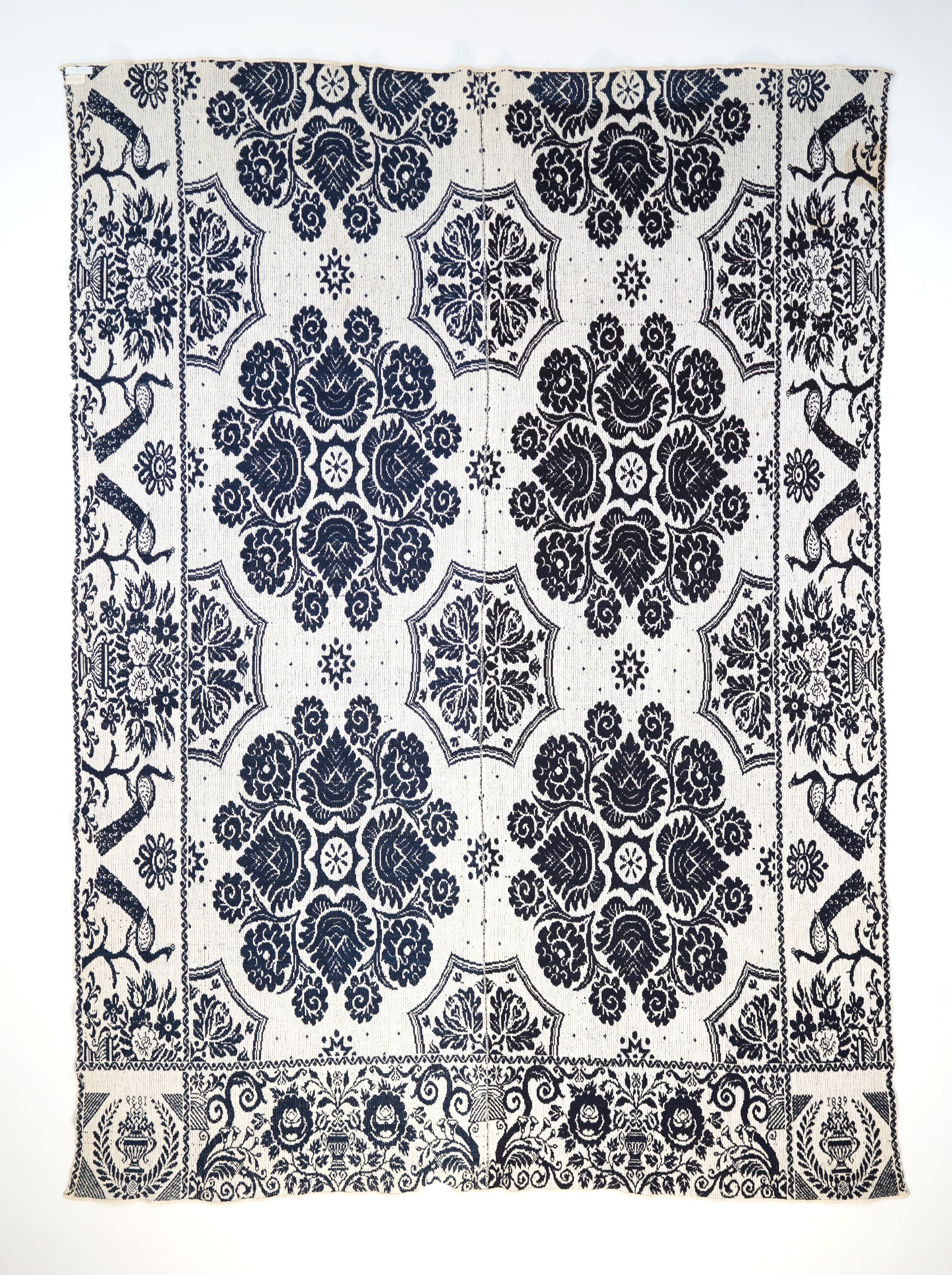 Figured coverlet; undyed cotton and blue wool, tied double cloth (Beiderwand). Coverlet has two panels joined by a center seam. (The color of the blue wool on the right panel and in a 2.5 inch strip at the top of the left panel is lighter than the blue of the remaining left panel.) Selvedges on sides; top and bottom are hemmed. Central motif is a pattern made up of large floral medallions separated by smaller floral medallions framed within a curved eight-sided shape. Border contains peacocks and oval vases filled with flowers. Corner blocks contain an urn encircled by leaves and the woven text.Collection