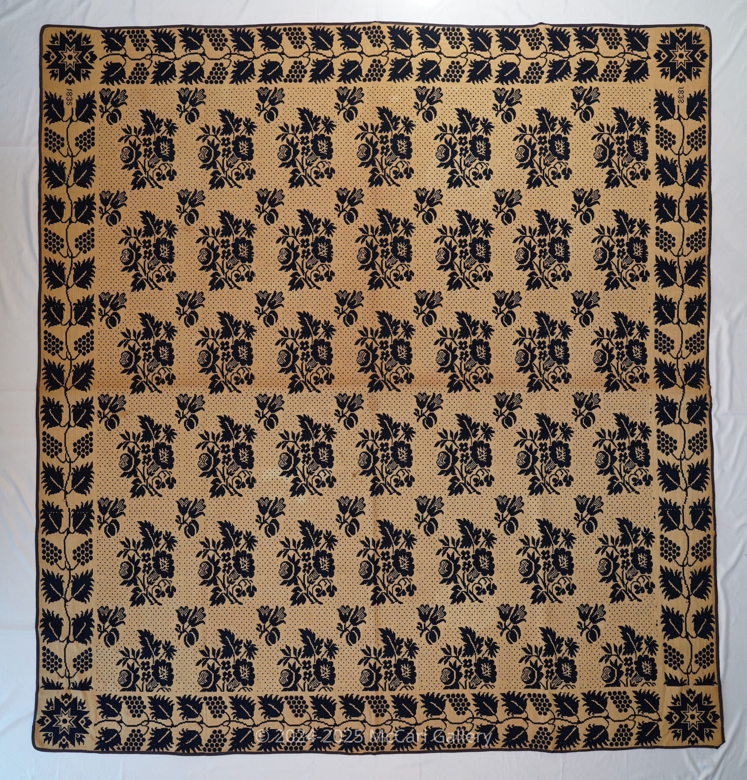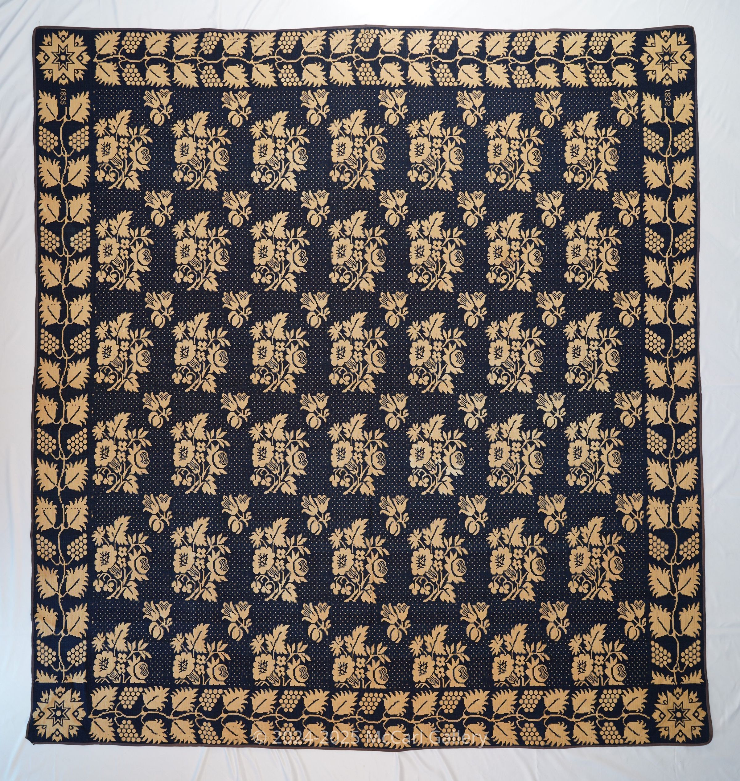 Natural and navy figured double weave coverlet; seamless. Border on four sides, no fringe.Collection