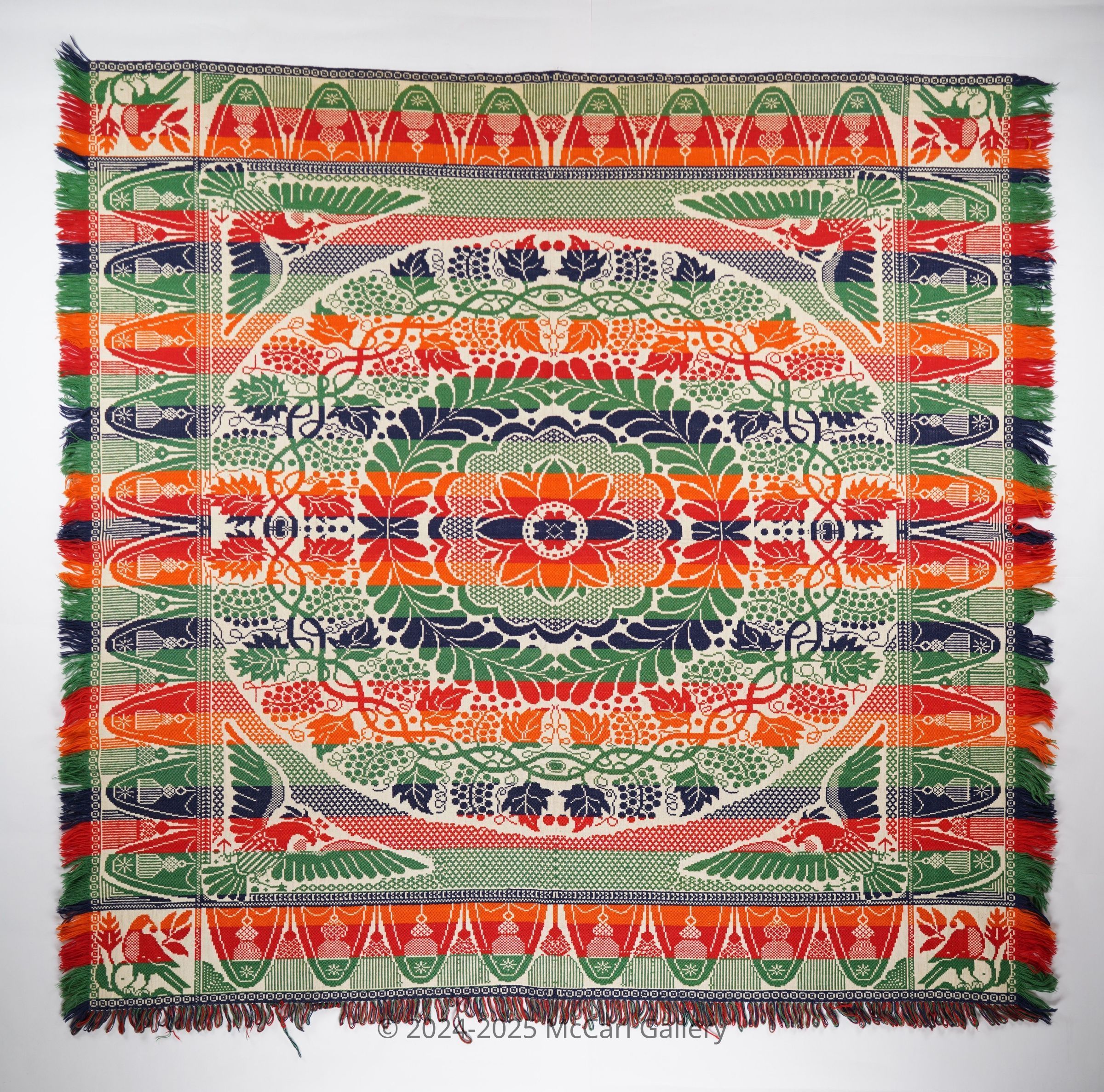 Red, orange, green, purple, and natural figured true beiderwand center medallion coverlet with fringe on three sides. Seamless.Collection