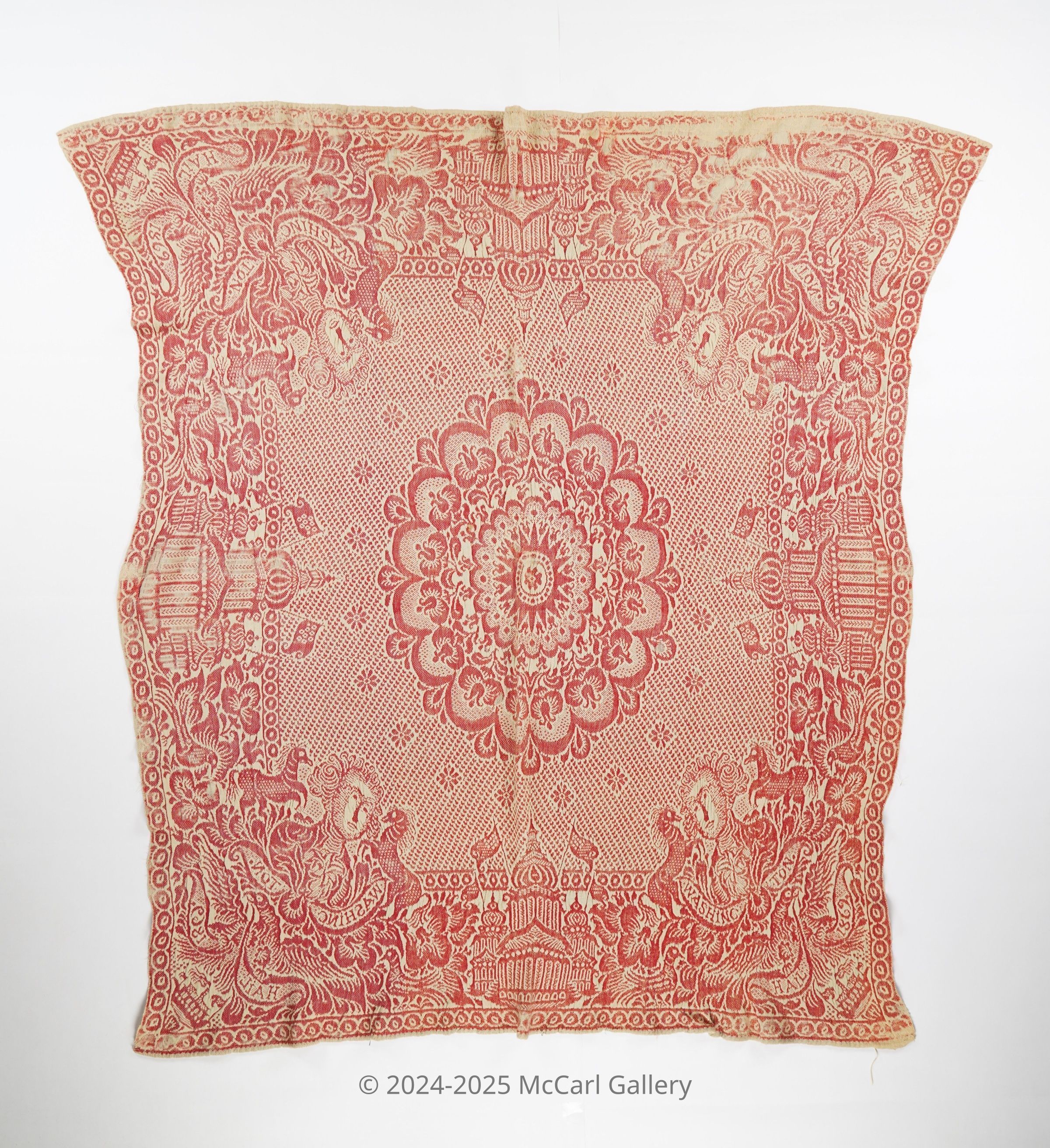 Figured and fancy coverlet with borders on 4 sides and no fringe. Woven full-width; seamless. Red wool with undyed cotton. Center medallion pattern with patriotic Washington border on all sides. Unknown weaver, 1869.Collection