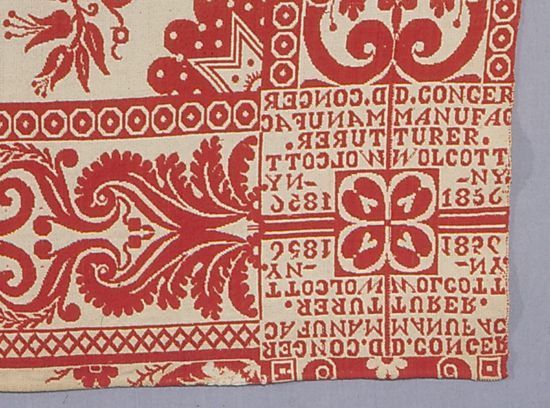 Figured coverlet; undyed cotton and red wool, double cloth. Selvedges on either side; hemmed top and bottom. Central motif consists of large medallions with an open petal flower in the center surrounded by a scrolling wreath design. Between the medallions are star with hearts in between the points. The stars are encircled by a floral motif. Border on all sides contain a foliage and scroll design.Collection