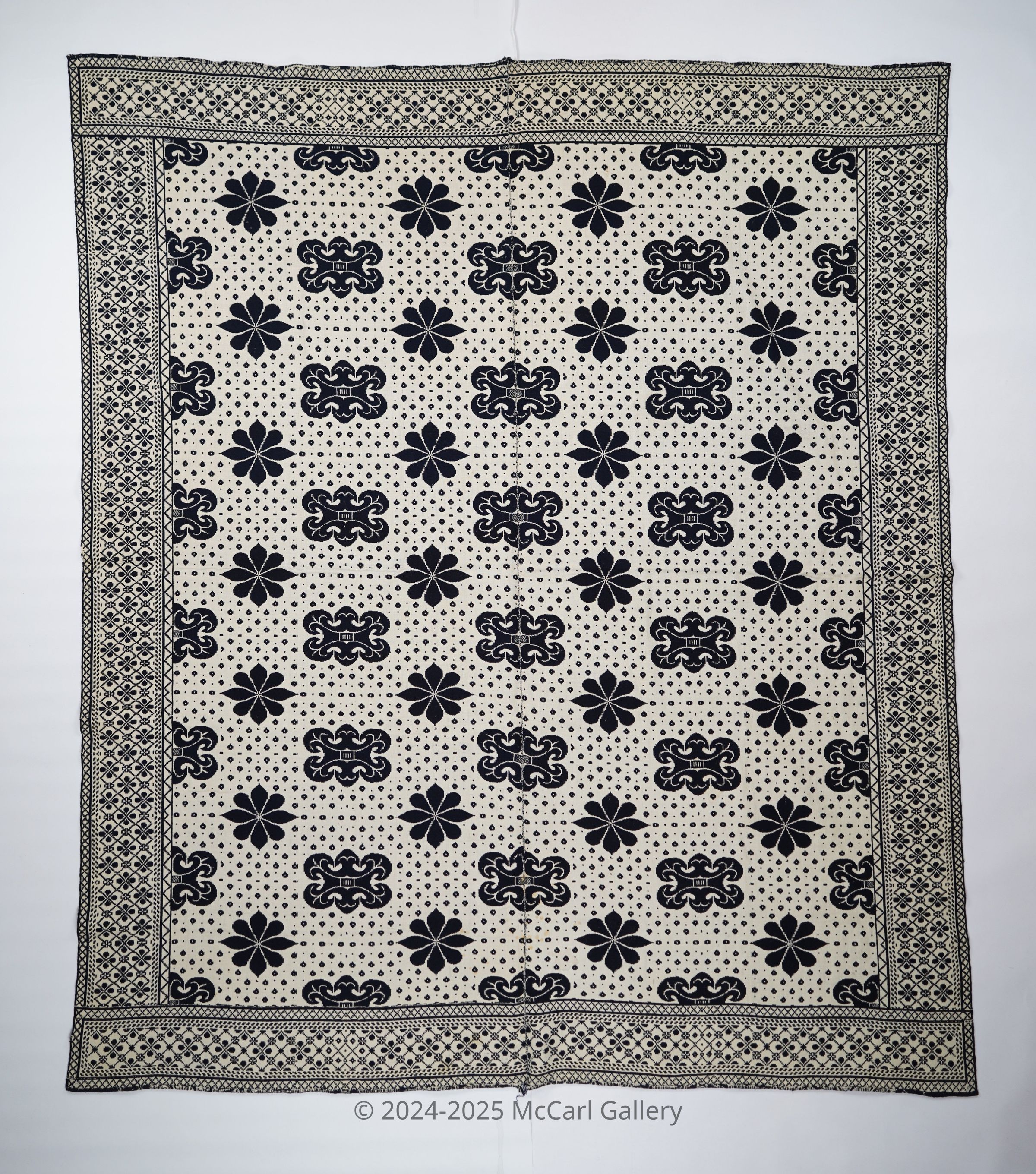 Navy and natural figured tied half doublecloth coverlet with border on four sides. Two joined panels.