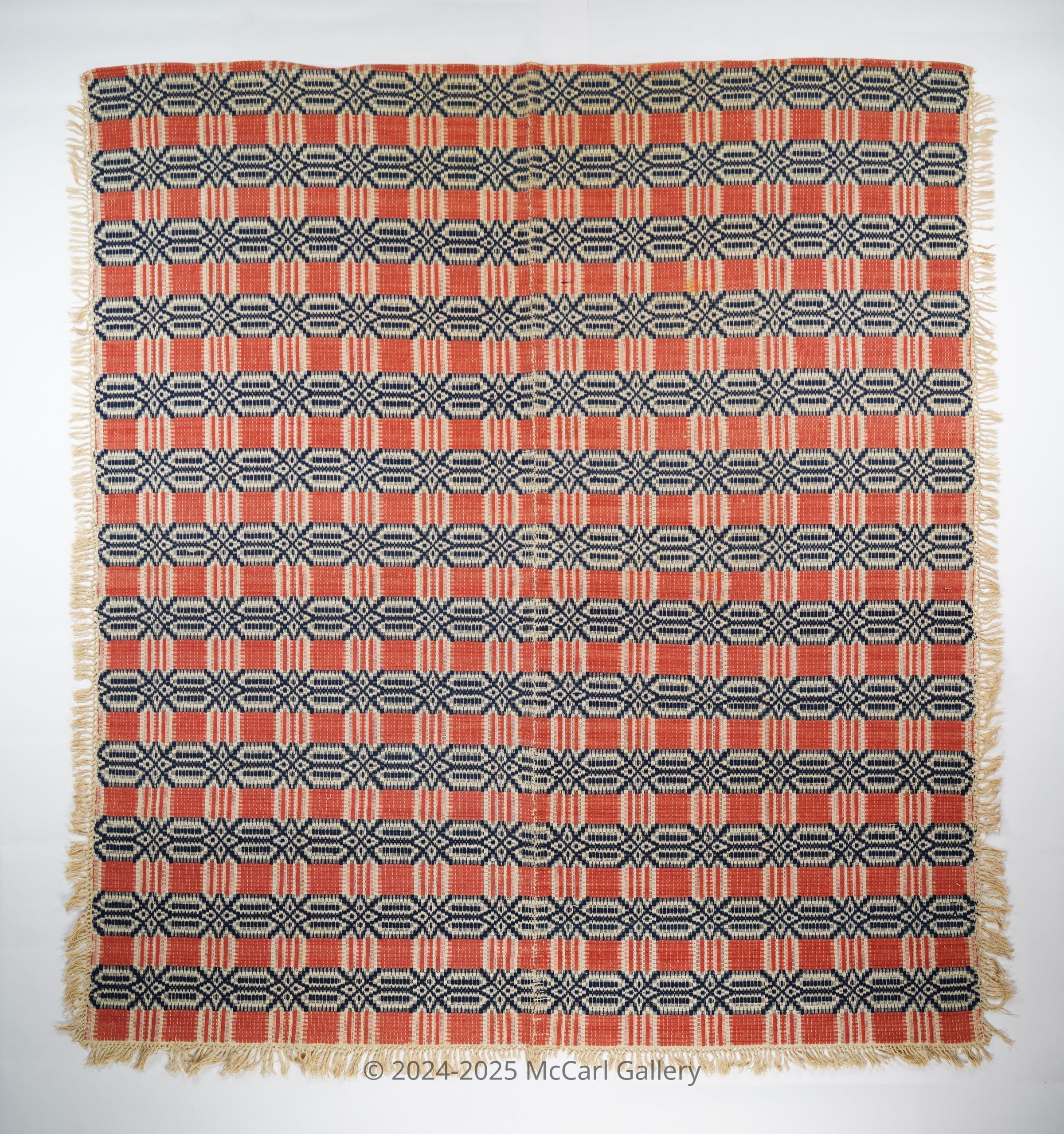 Red, navy, and natural geometric overshot coverlet with tied fringe on three sides. Two joined panels.