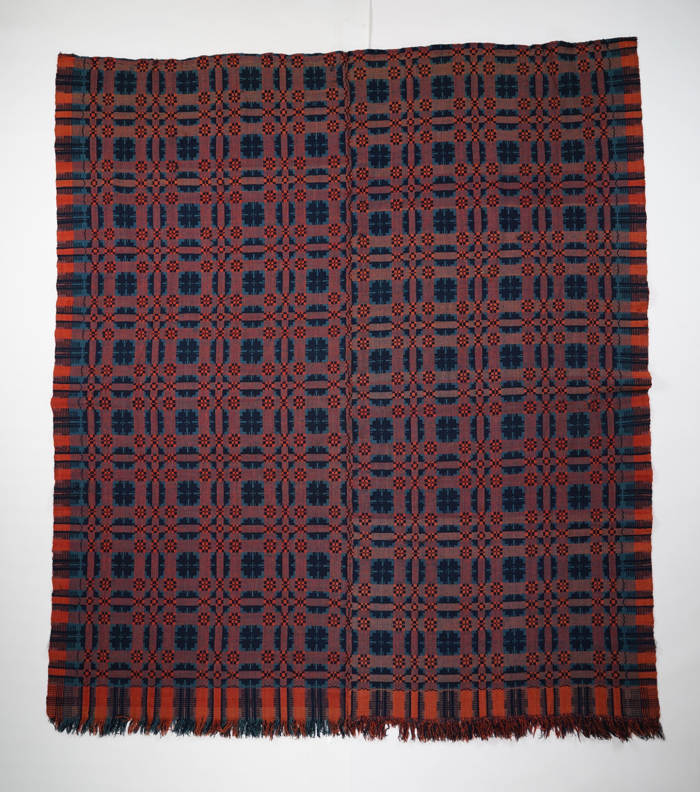 Red, blue, and navy geometric double weave coverlet with border on three sides and self-fringe along bottom. Two joined panels.Collection