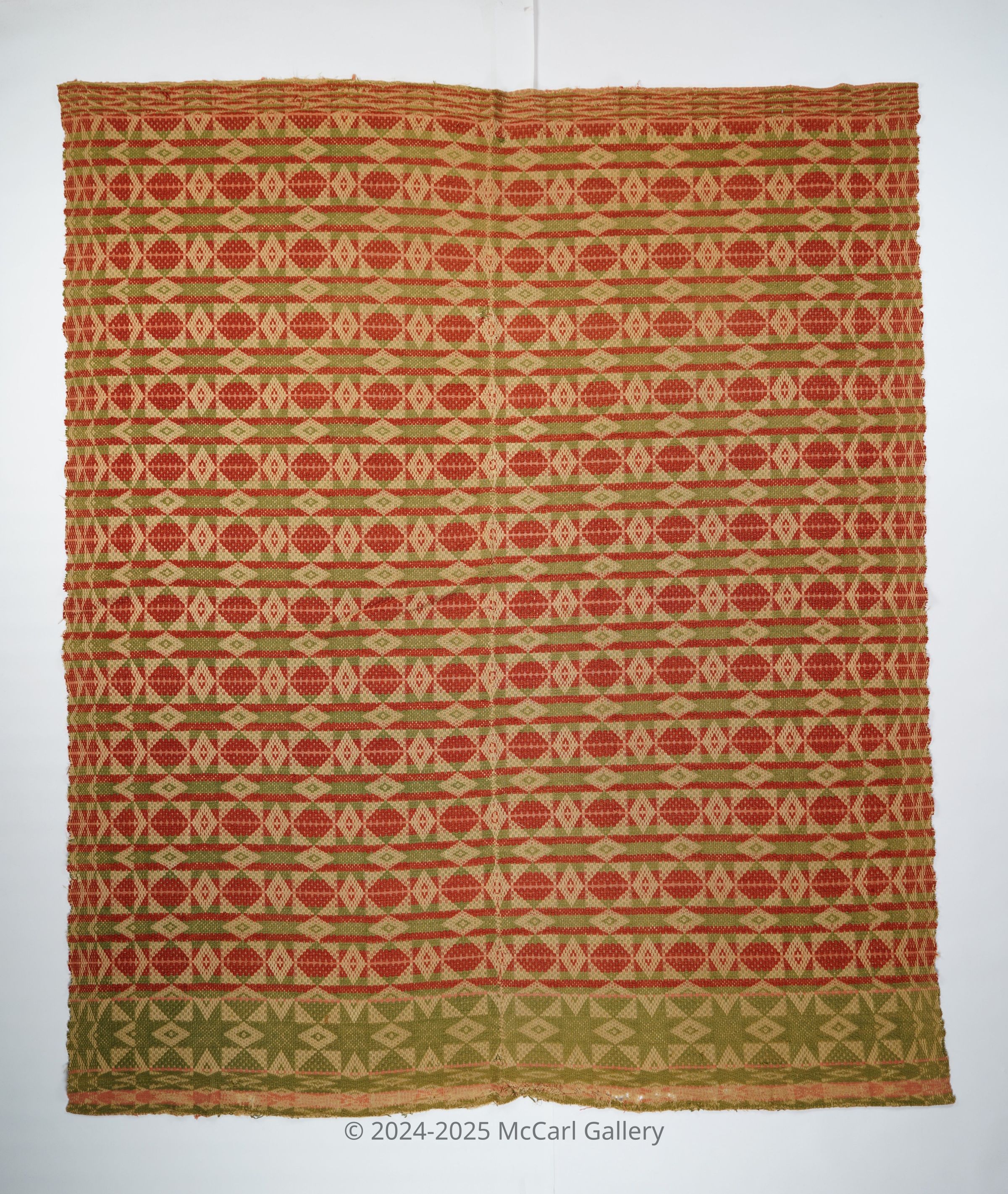 Red, green, pink, and natural geometric coverlet with border on four sides. Two joined panels.Collection