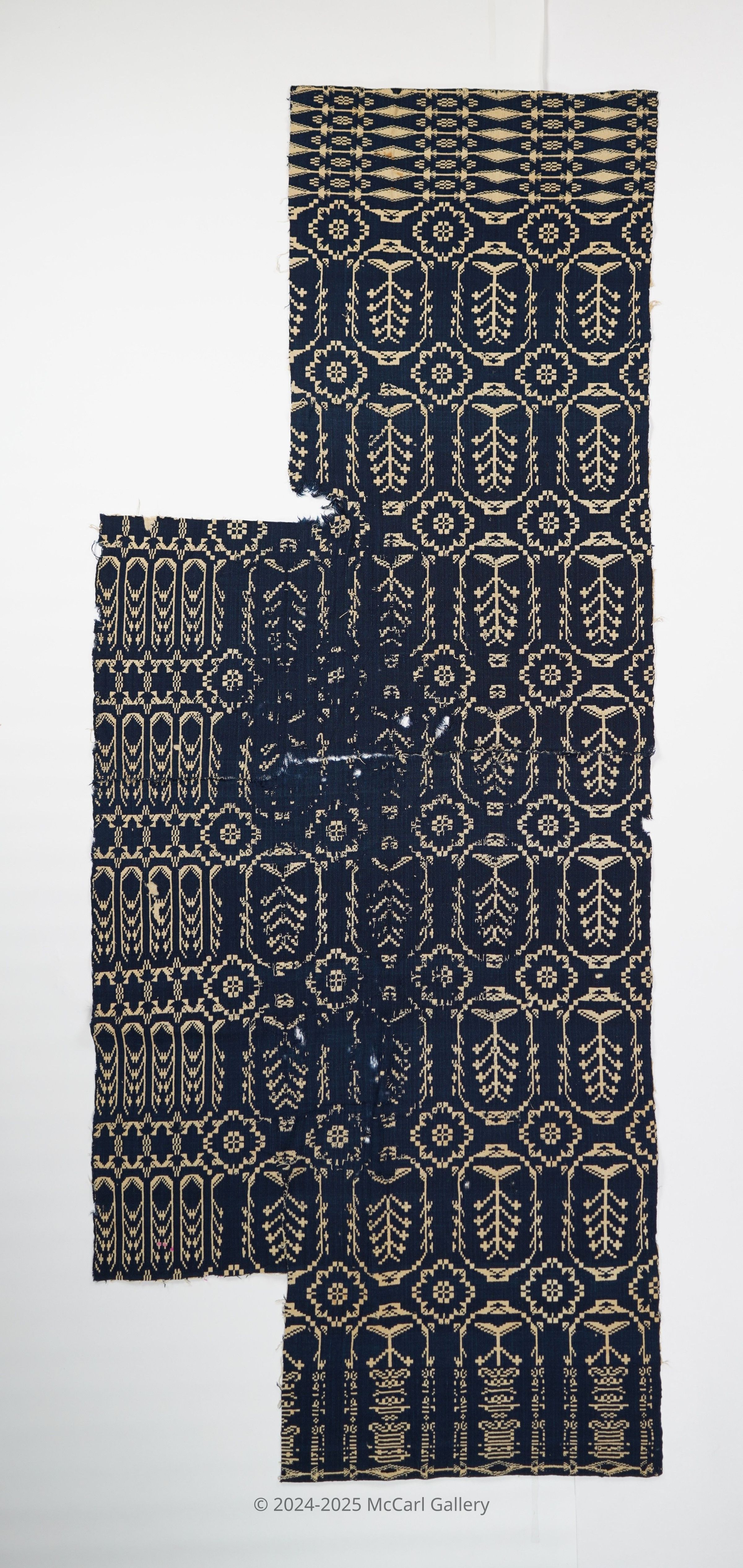 Navy and natural figured double weave coverlet with border on three sides. One panel. Woven for Sarah Smith. Corners have been cut from this panel.Collection