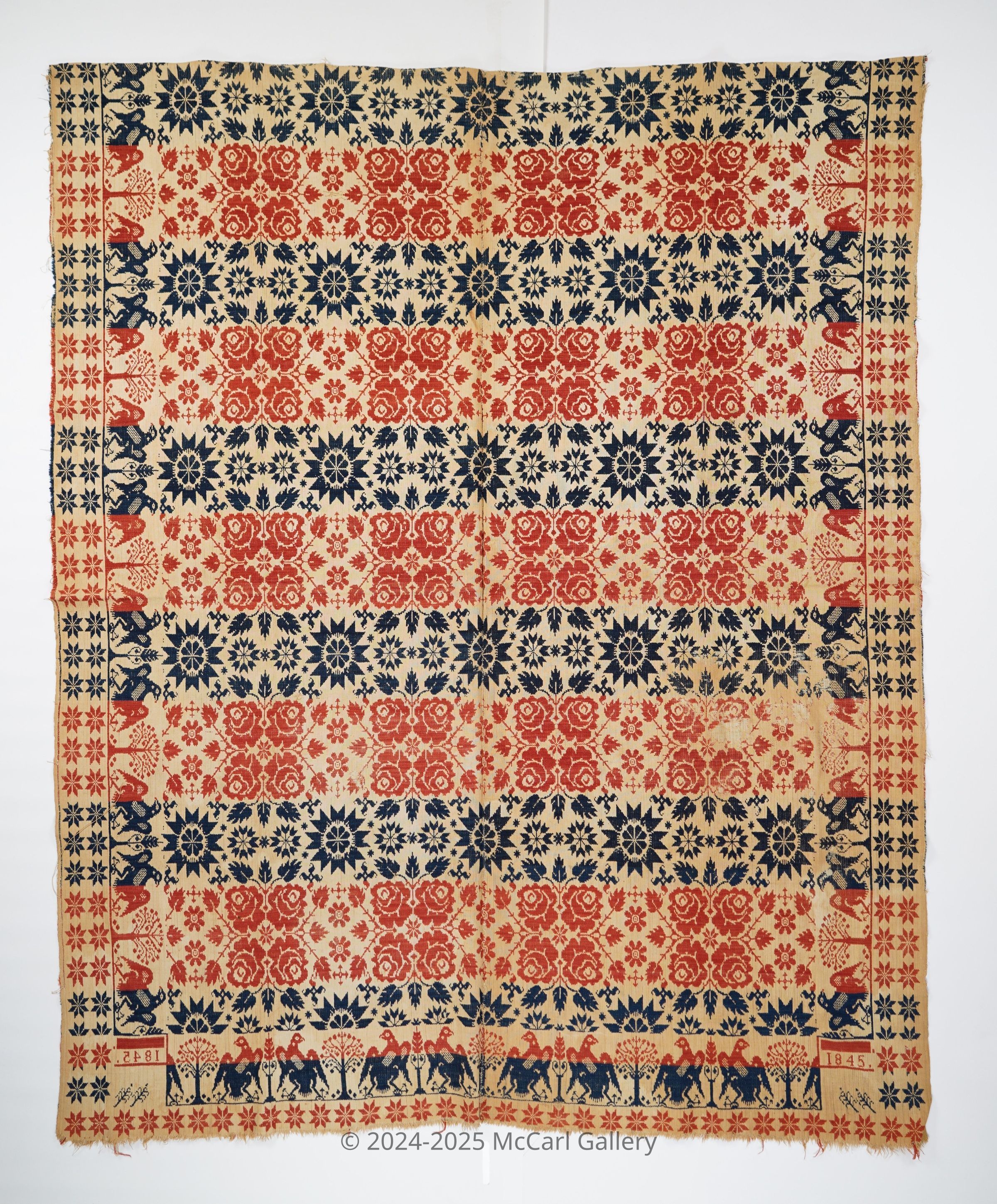 Navy, red, and natural figured tied beiderwand coverlet with eagle and tree border on three sides. Two joined panels. Woven in 1845.Collection