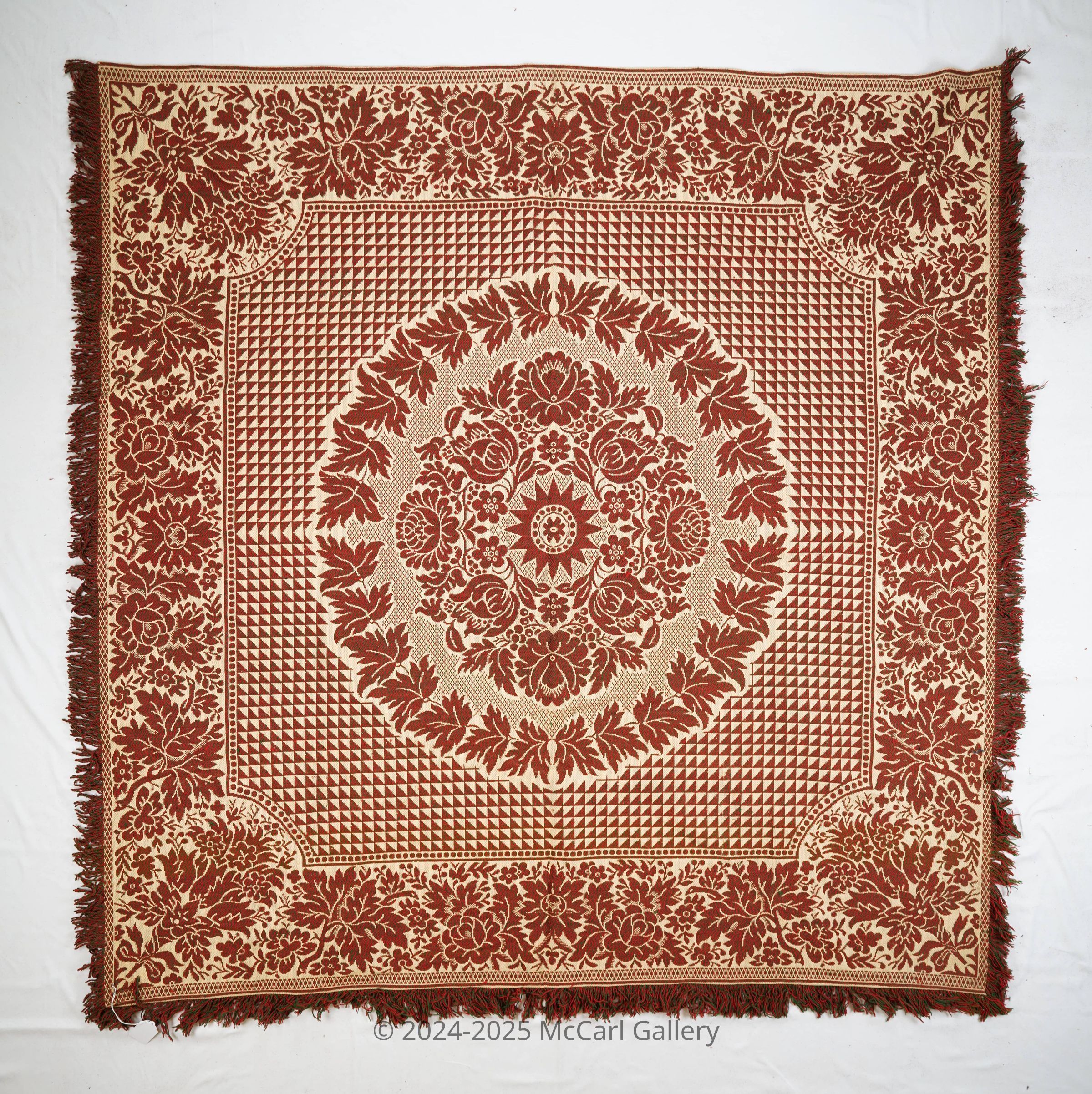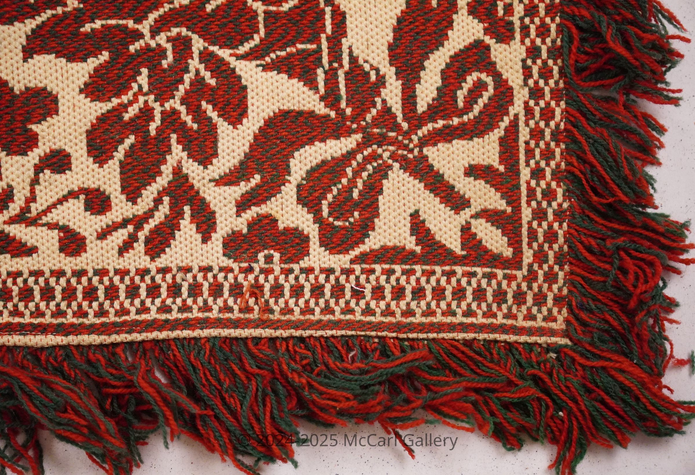 Red, white, and green figured Tied Beiderwand 2:1 coverlet; seamless. Border on four sides; fringe on three sides.