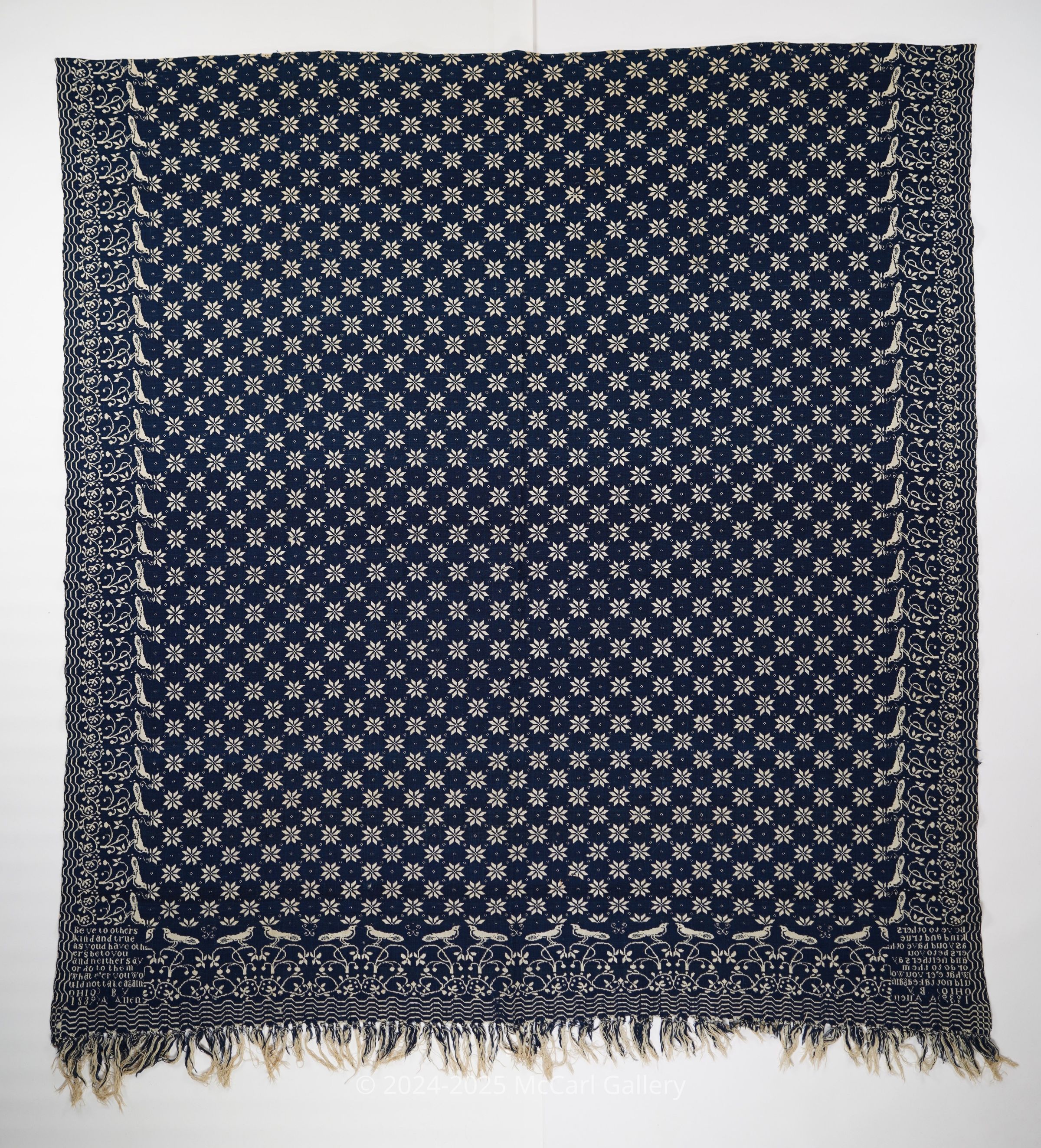 Navy and natural figured double weave coverlet with bird border on three sides and self-fringe along bottom. Woven by Abram Allen in Union Township, Clinton Co., Ohio in 1839.Collection