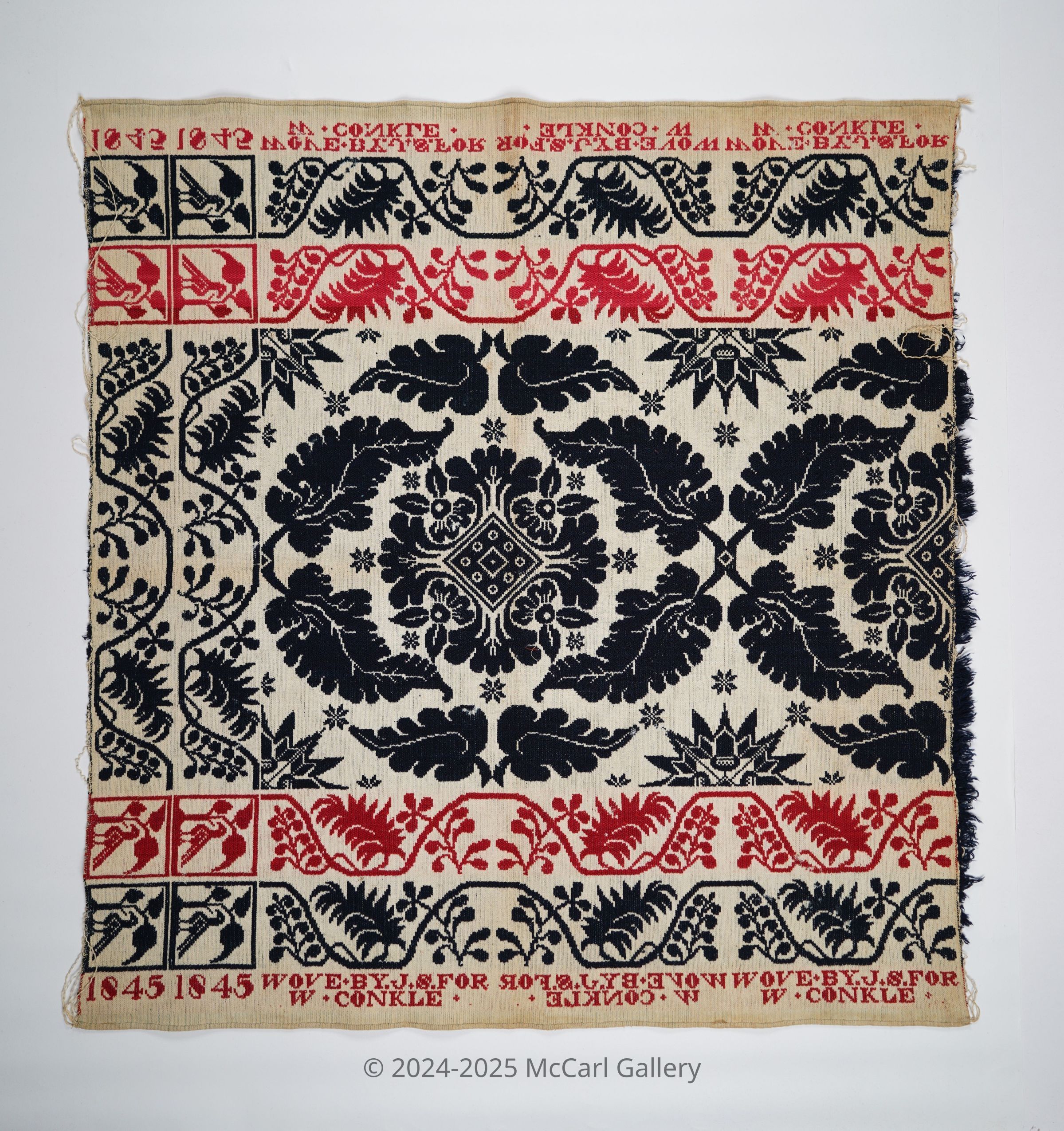 Red, navy, and natural figured tied half doublecloth crib coverlet with border on three sides. Woven for W. Conkle by J. S. in 1845.Collection