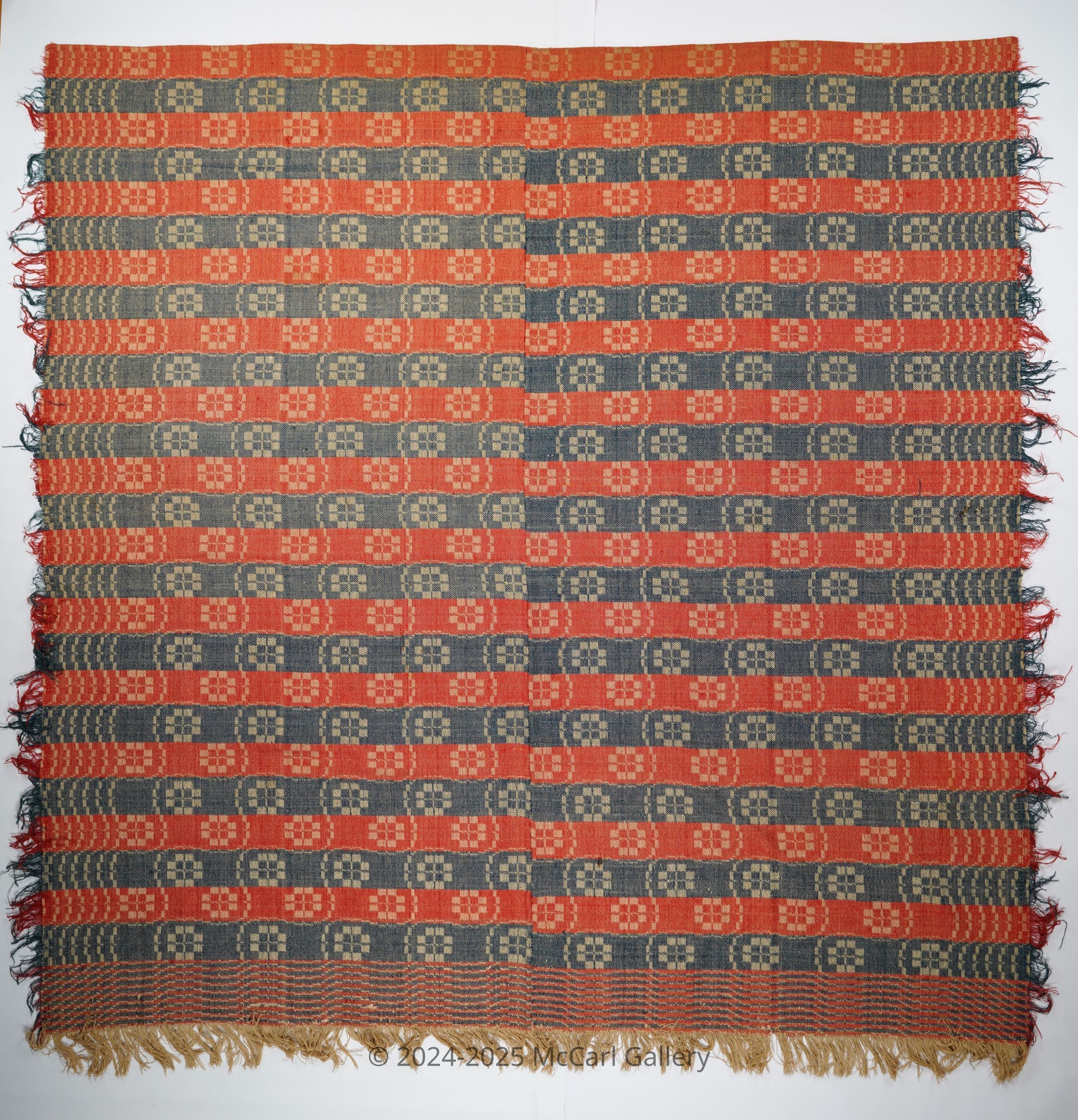 Red, navy, and natural geometric block twill coverlet with border and self-fringe on three sides. In the "Cat Track and Snail Trail" pattern. Two joined panels.Collection