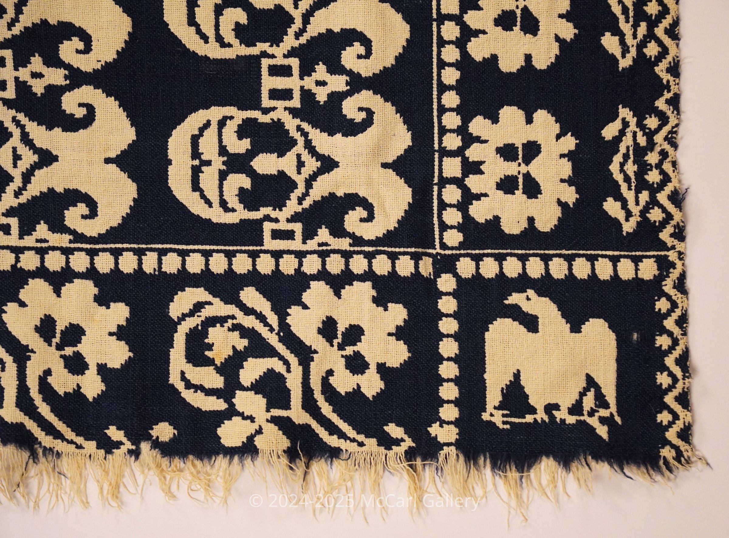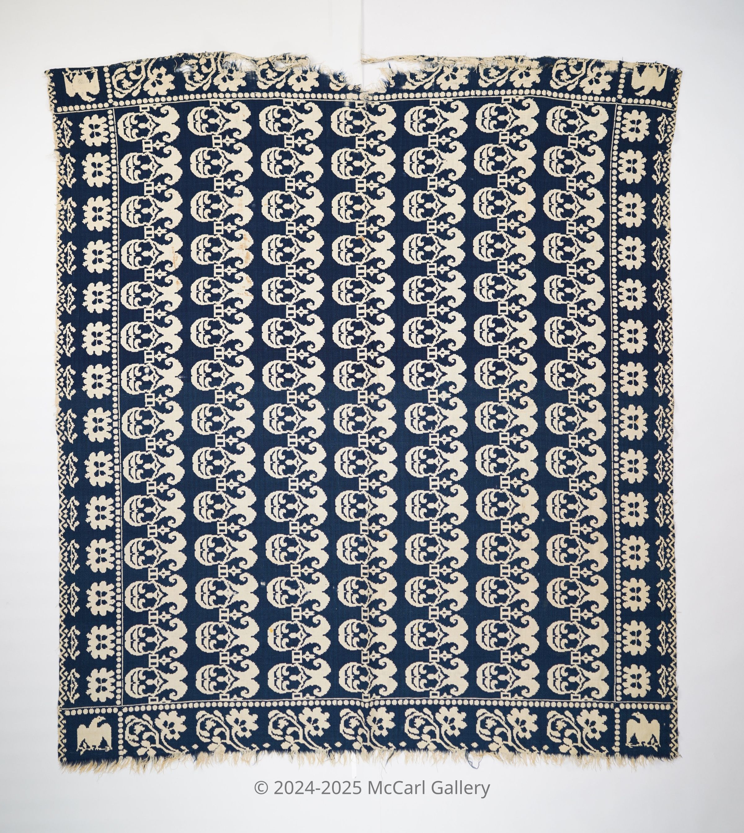 Navy and natural figured double weave coverlet with border on four sides. Seamless.
