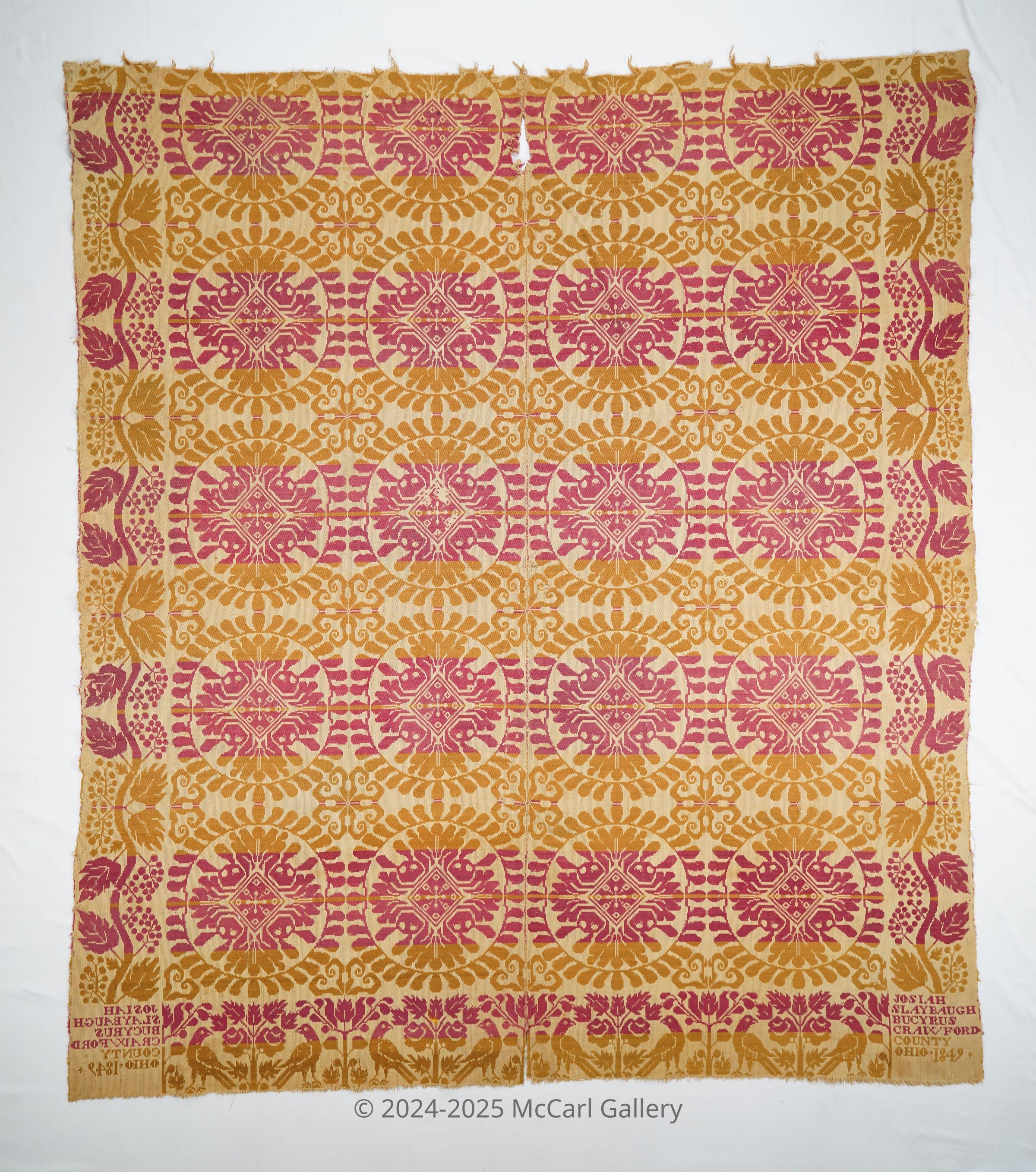Natural, yellow, and red figured tied beiderwand 2:1 coverlet; two panels joined by a center seam. Border on three sides; no fringe.Collection