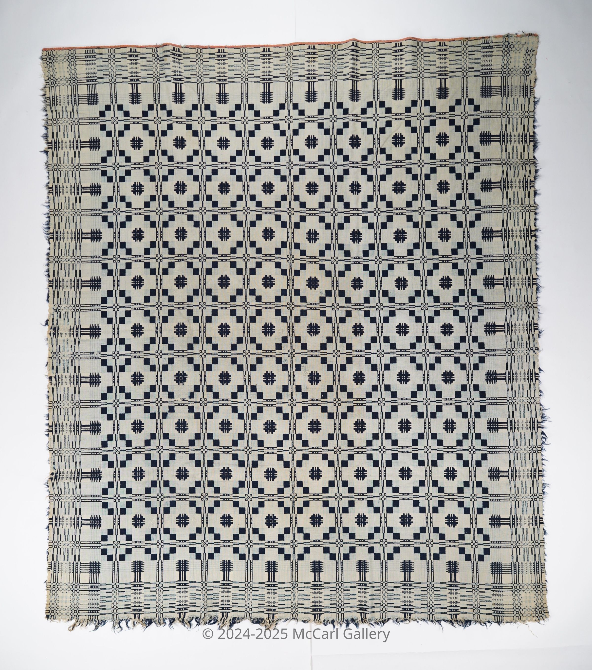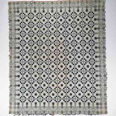 Light blue, navy blue, and natural geometric doubleweave coverlet. Reportedly woven for Elisabeth Frick.Collection
