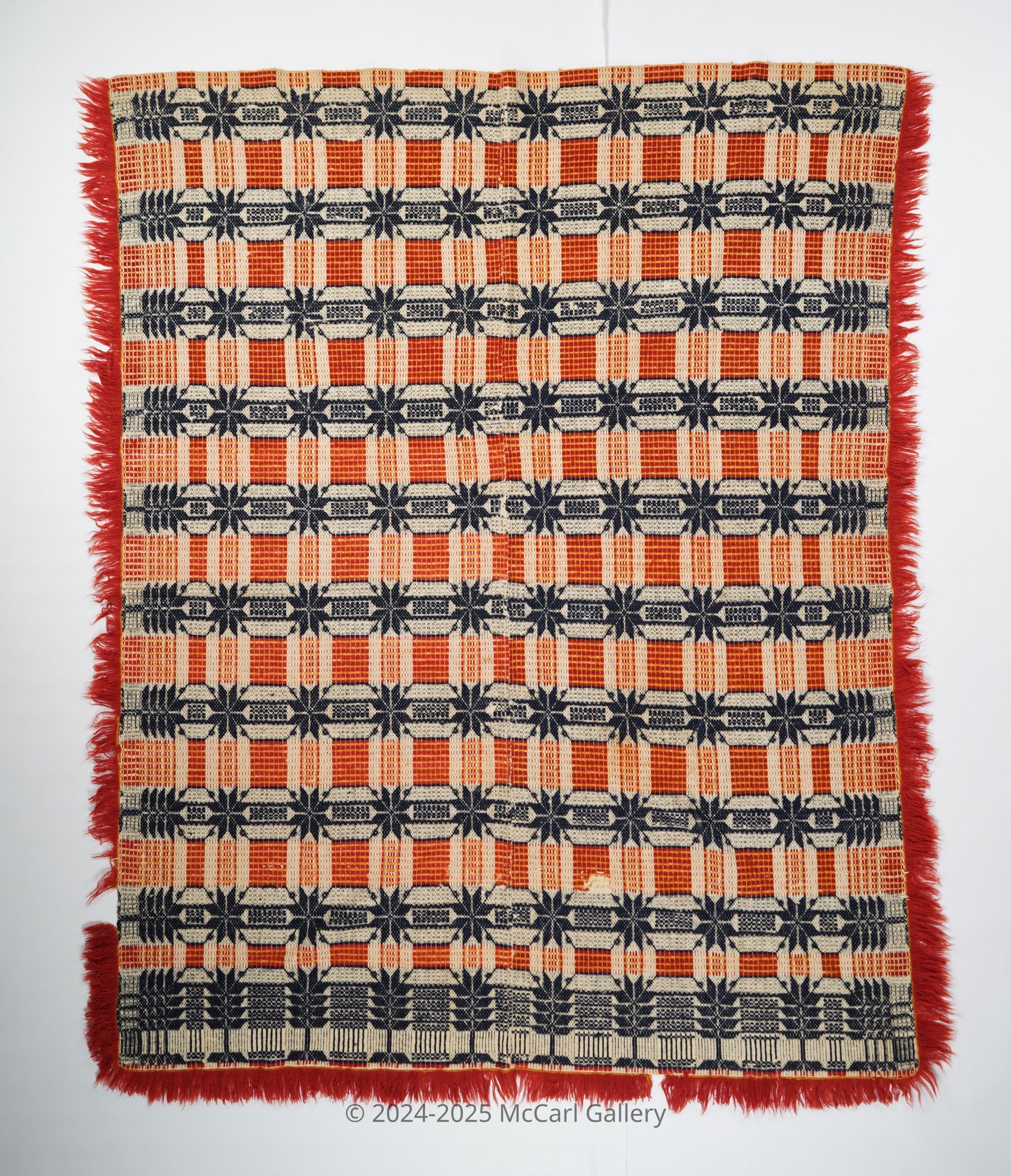 Red, navy, orange, and natural geometric coverlet with border and applied fringe on three sides. Two joined panels.Collection
