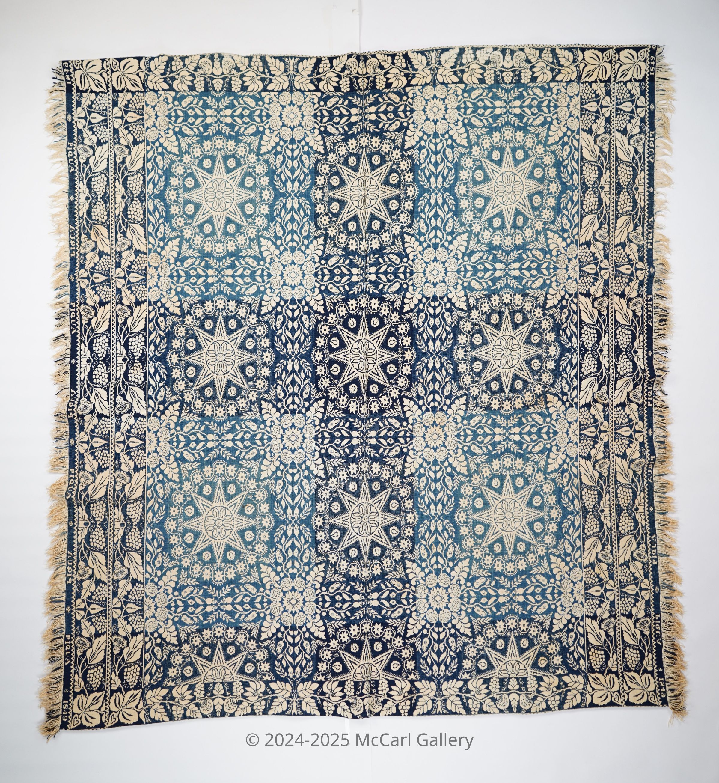 Blue, navy, and natural figured double weave coverlet with border on four sides and self-fringe on left and right sides. Two joined panels. Woven in Piqua, Miami Co., Ohio in 1849.Collection