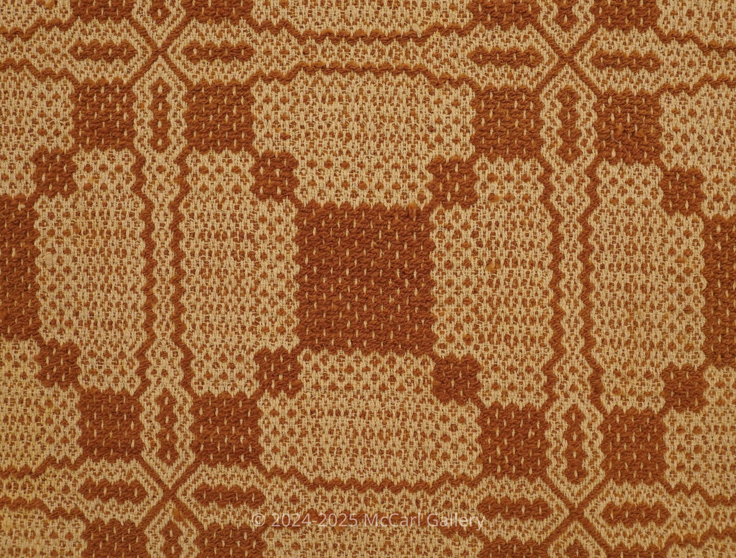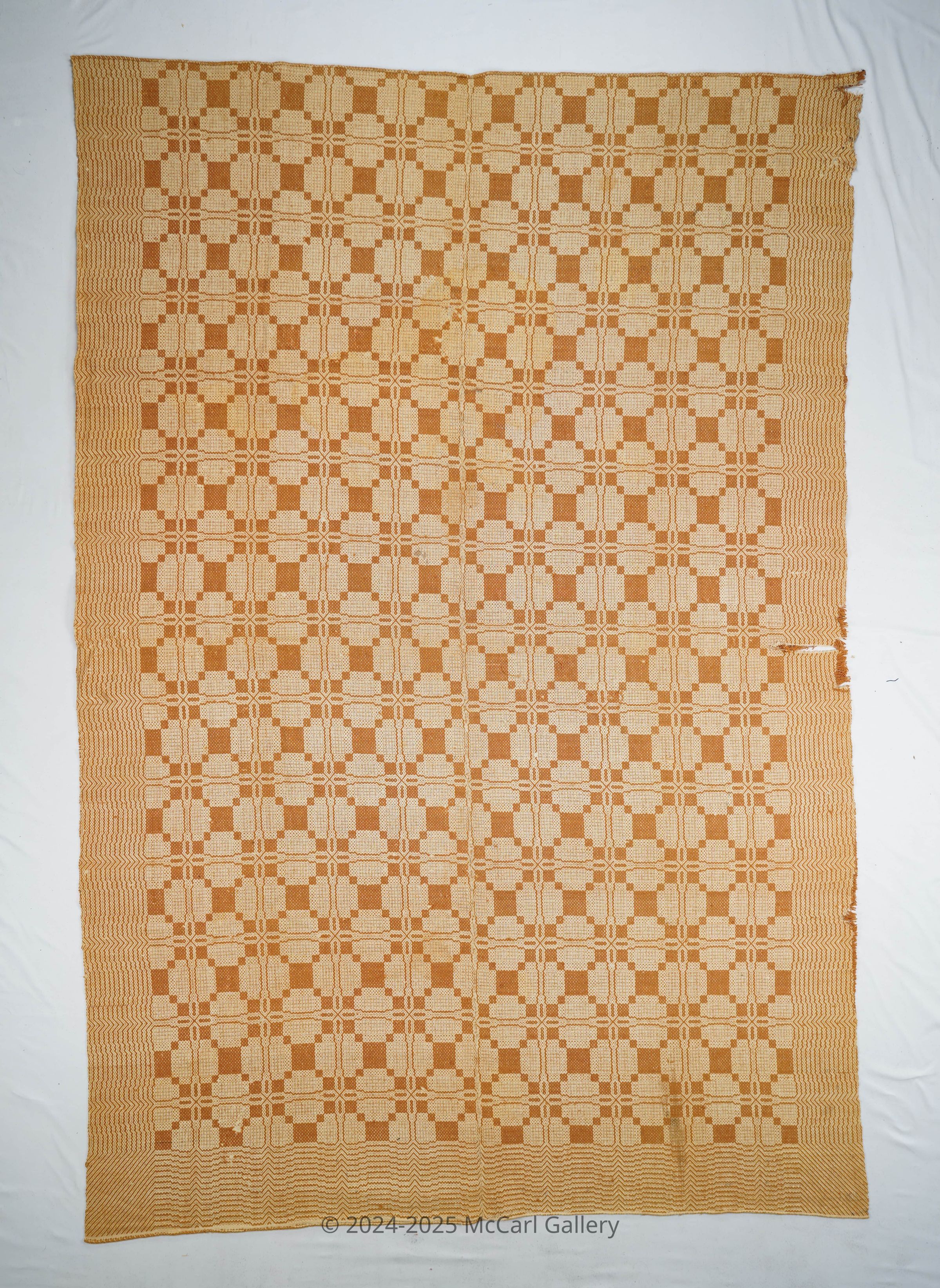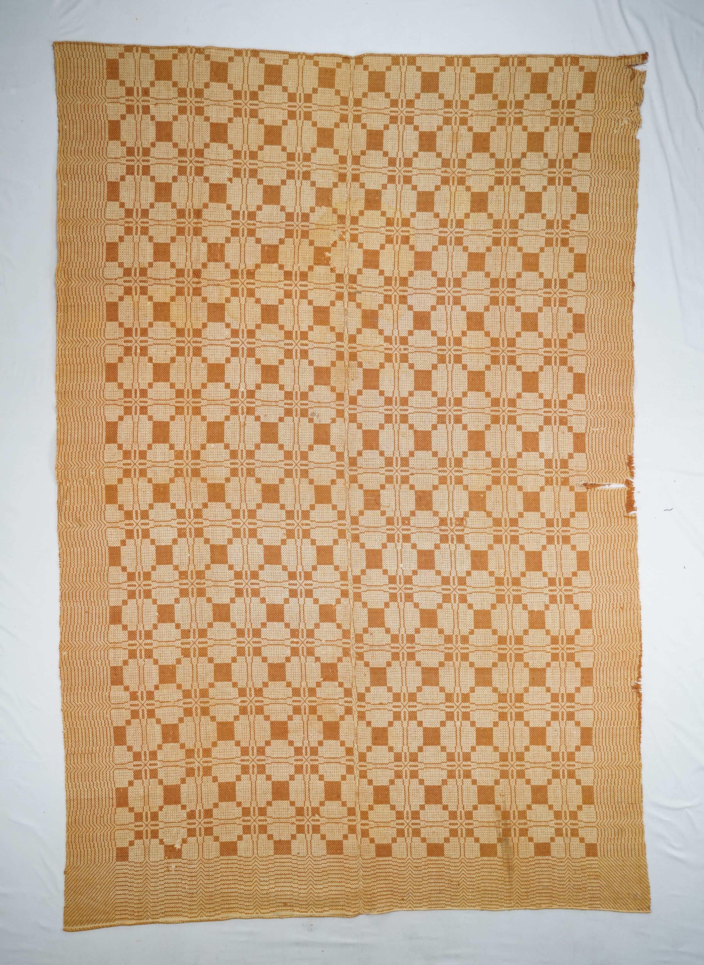 Natural and orange geometric gebrochene coverlet; two panels joined by a center seam. Border on three sides; no fringe.