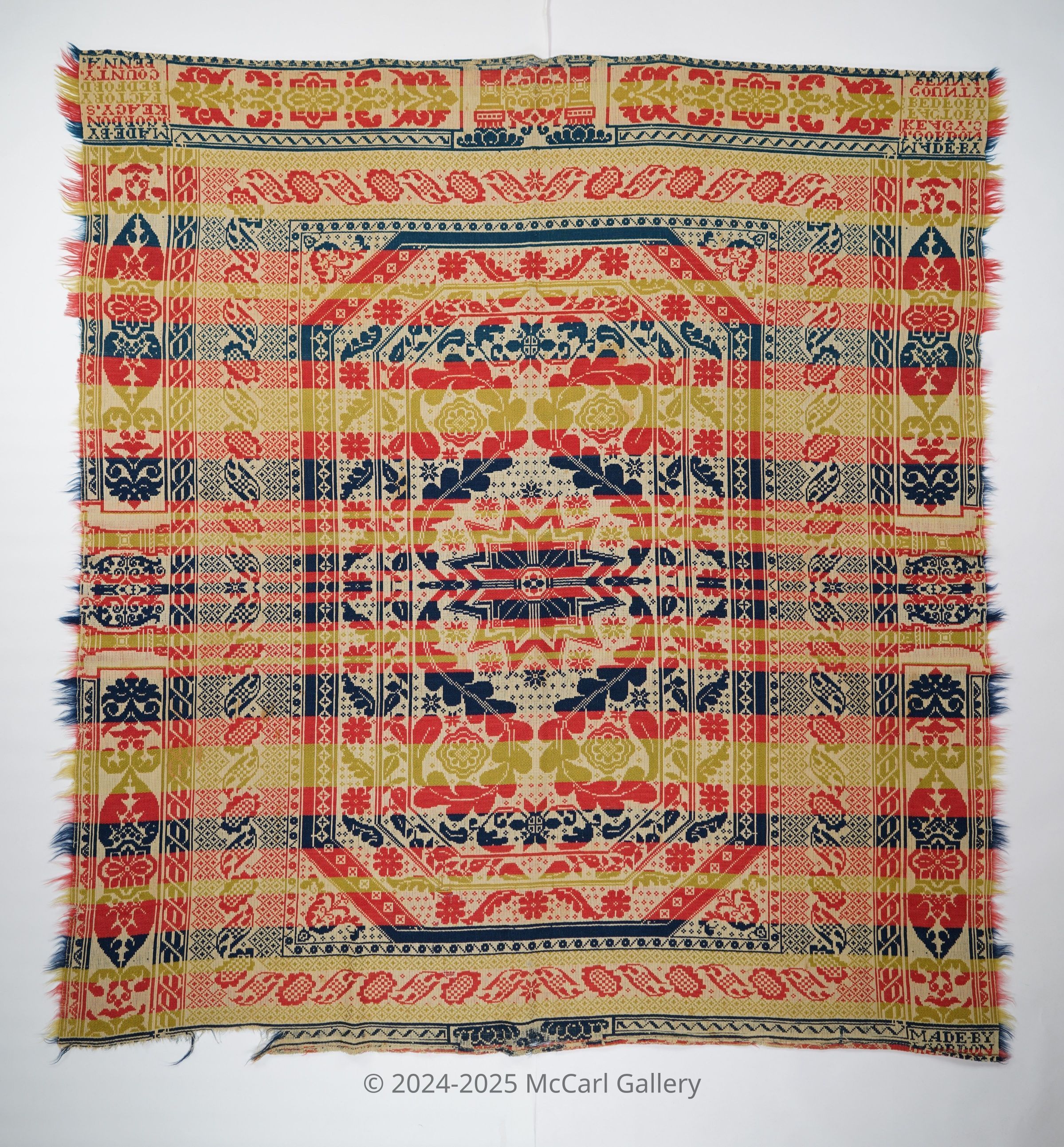 Red, yellow, navy, and natural figured tied half doublecloth coverlet with border on three sides and self-fringe on two sides. Seamless. Woven by J. Gordon at the Keagy Globe Factory in Bedford Co., Pennsylvania.Collection