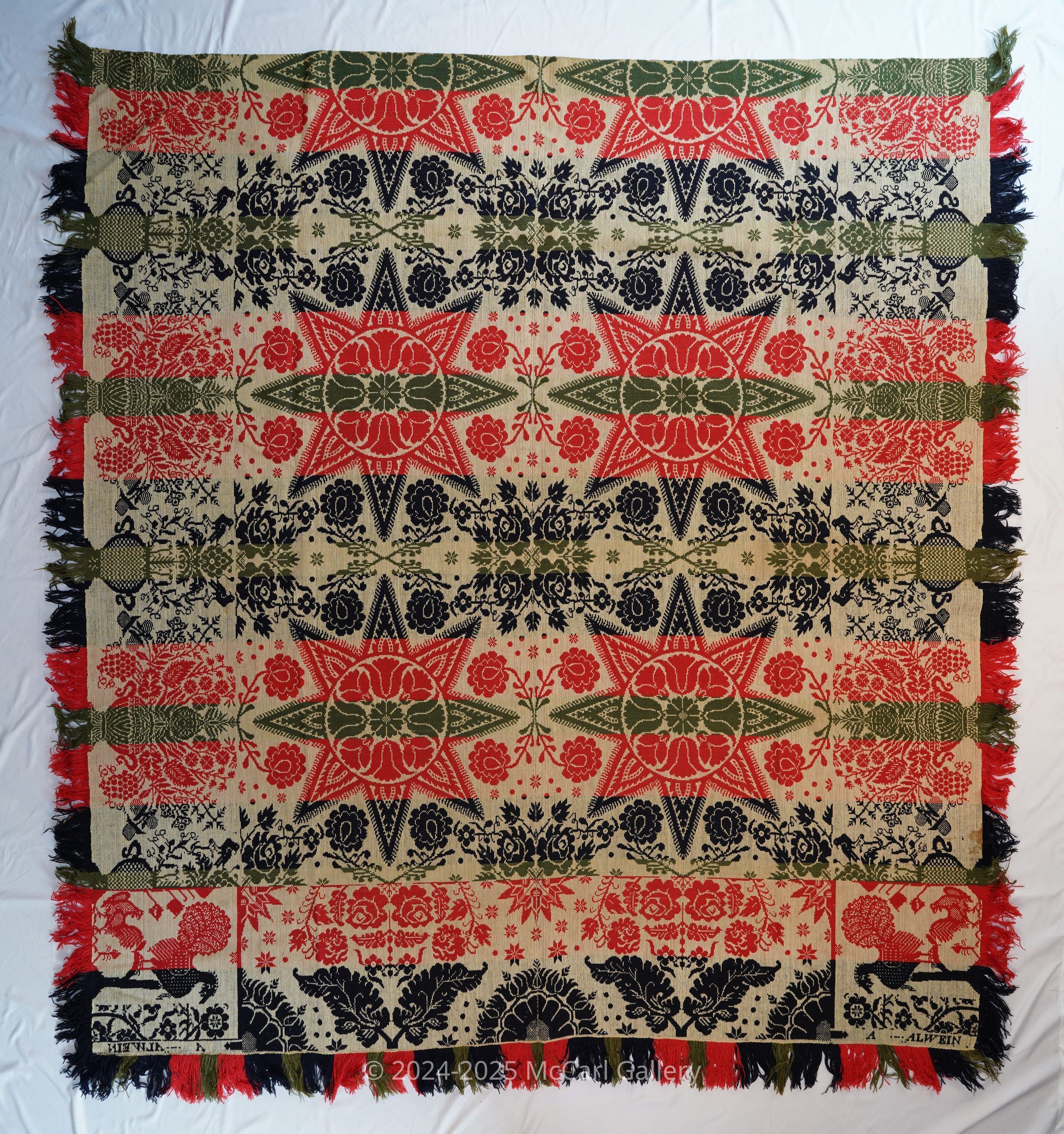 Natural, navy, red, and green figured tied beiderwand coverlet; two panels joined by a center seam. Border and fringe on three sides.Collection