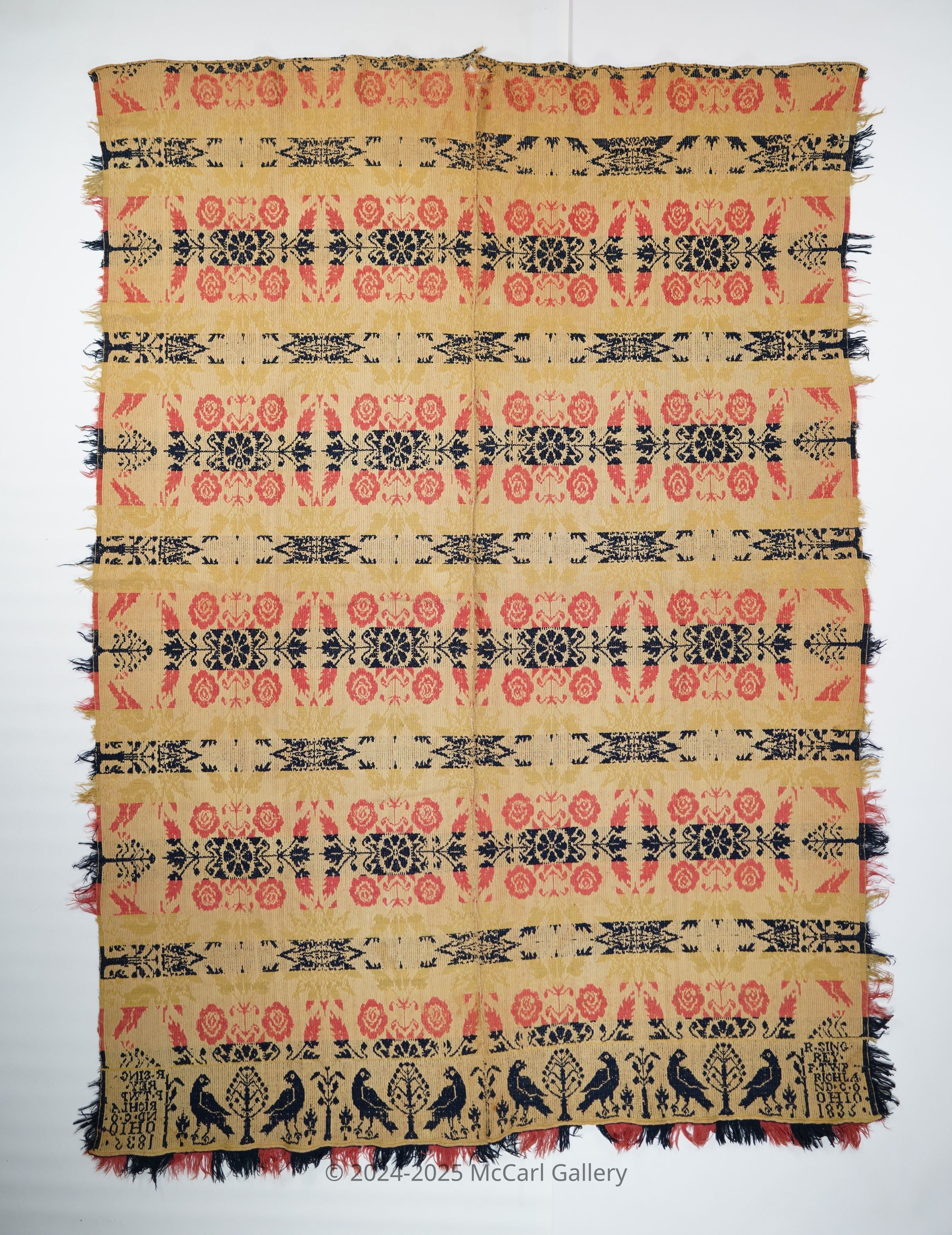 Red, yellow, navy, and natural figured tied beiderwand coverlet with self-fringe on left and right sides and applied fringe along bottom. Distelfink border on three sides. Two joined panels. Woven in (Perry Township?), Richland Co., Ohio in 1835 for R. Singrey.Collection