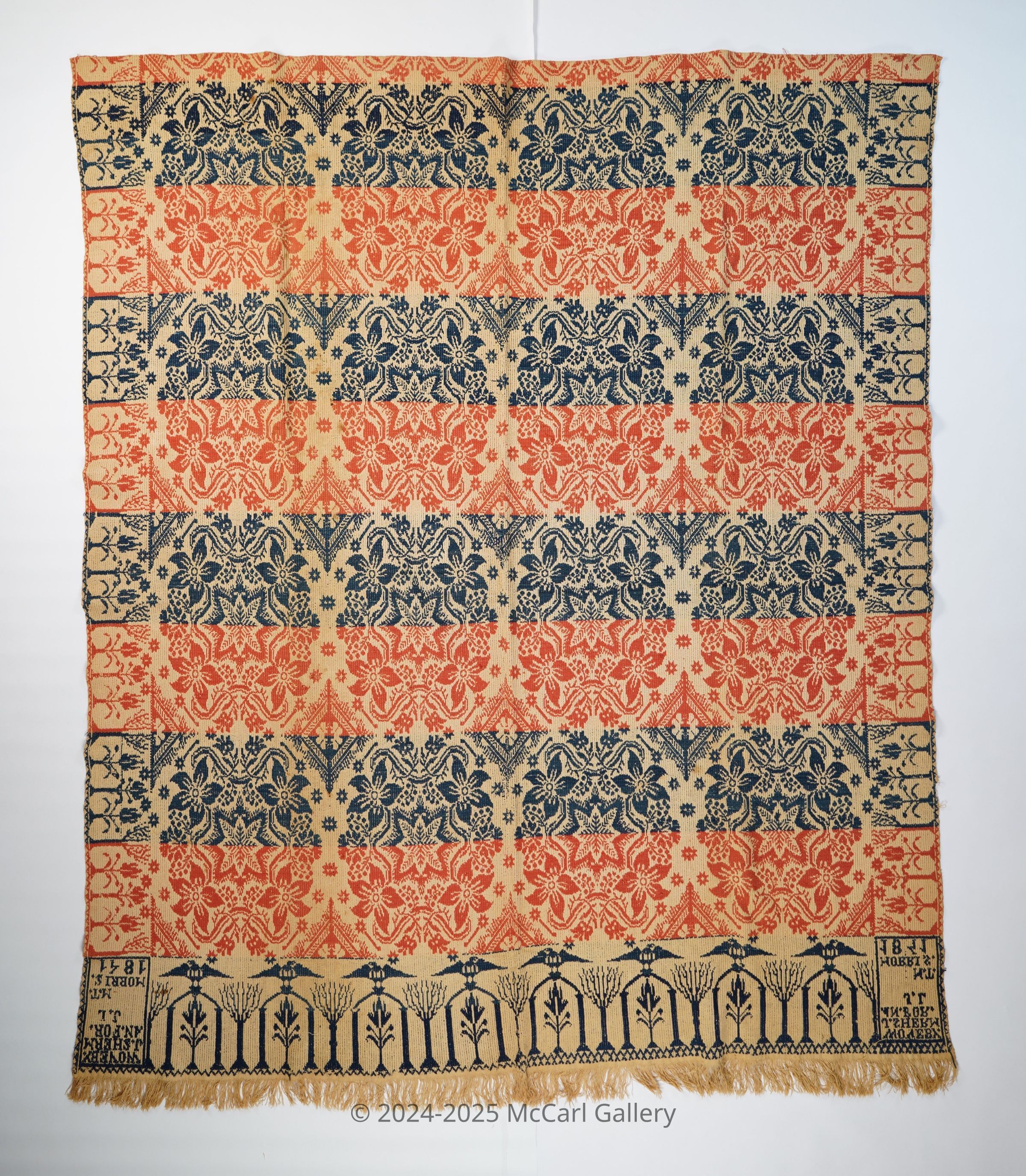 Red, navy, and natural figured tied beiderwand coverlet with border on three sides and self-fringe along bottom. Woven by Josiah Sherman for J.L. in Mount Morris in 1841.Collection