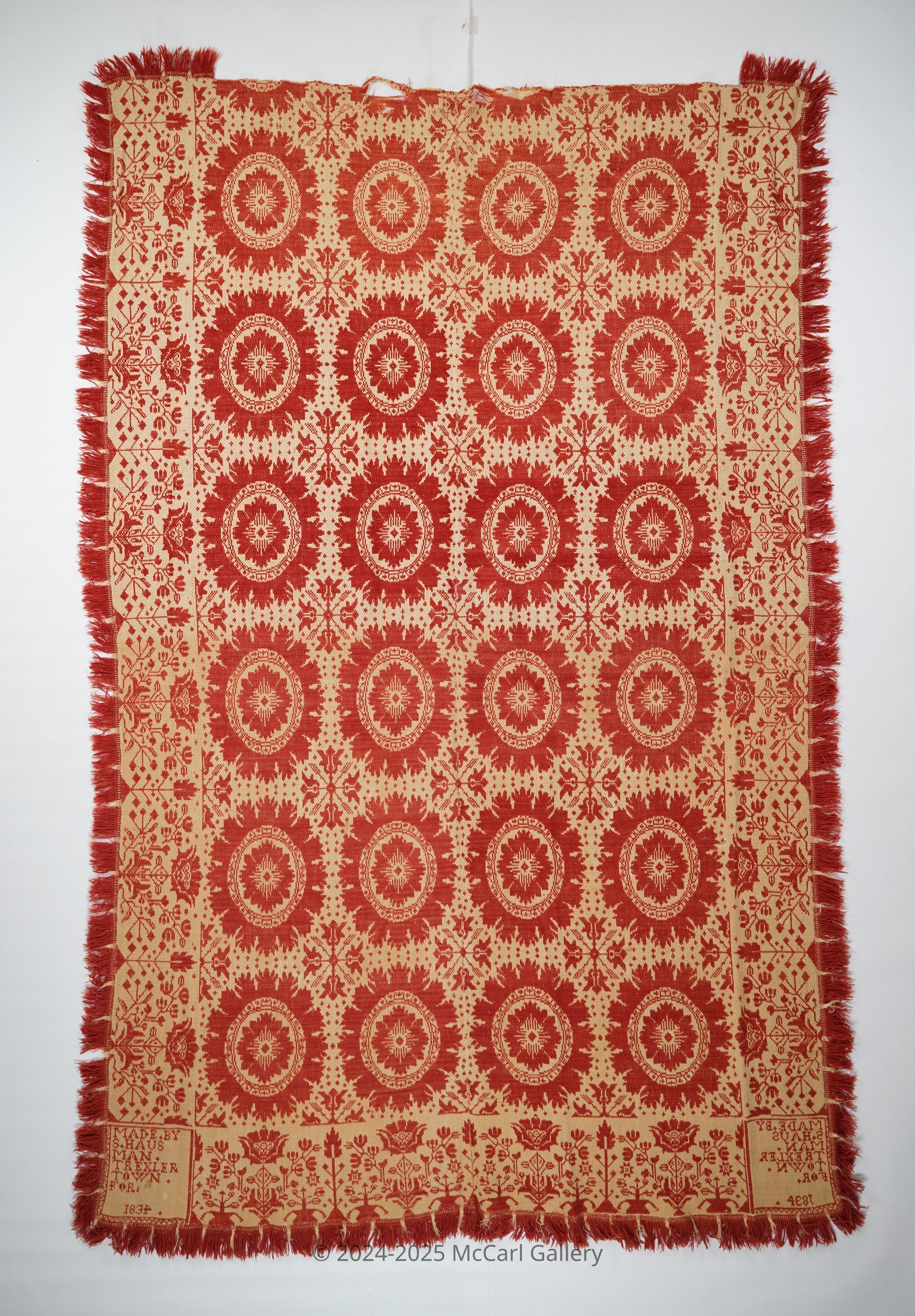 Red and natural figured tied beiderwand coverlet with border on three sides and applied fringe on four sides. Two joined panels. Woven by Solomon Hausman in Trexlertown, Upper Macungie Twp., Lehigh Co., Pennsylvania in 1834.Collection
