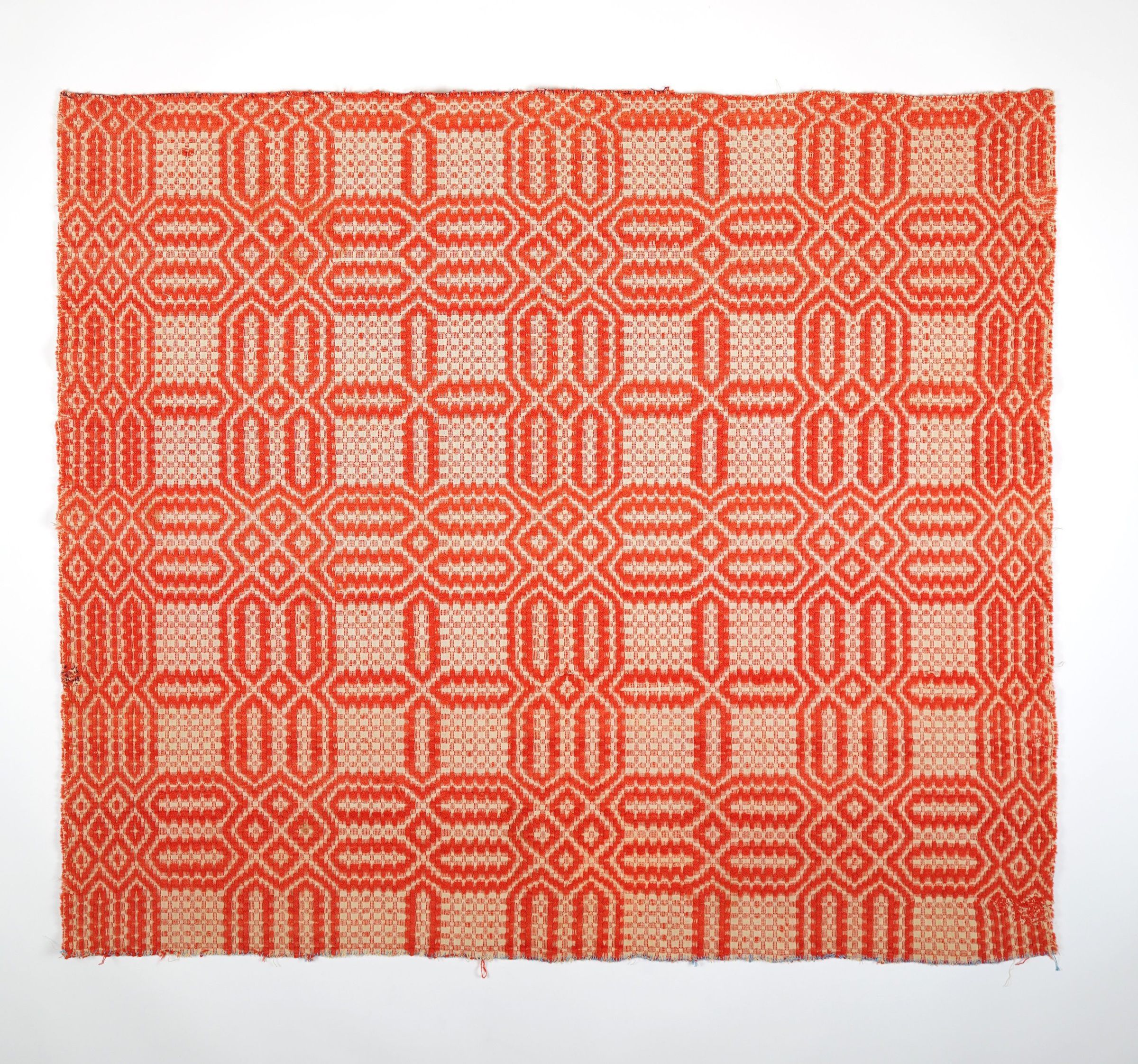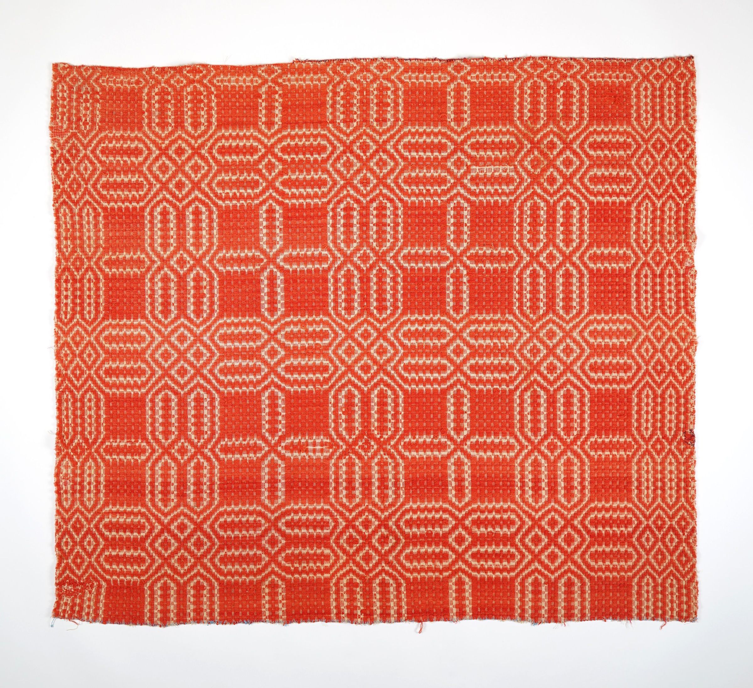Orange and natural overshot coverlet fragment; selvedge sides, top and bottom edge finished with blanket stitch.Collection