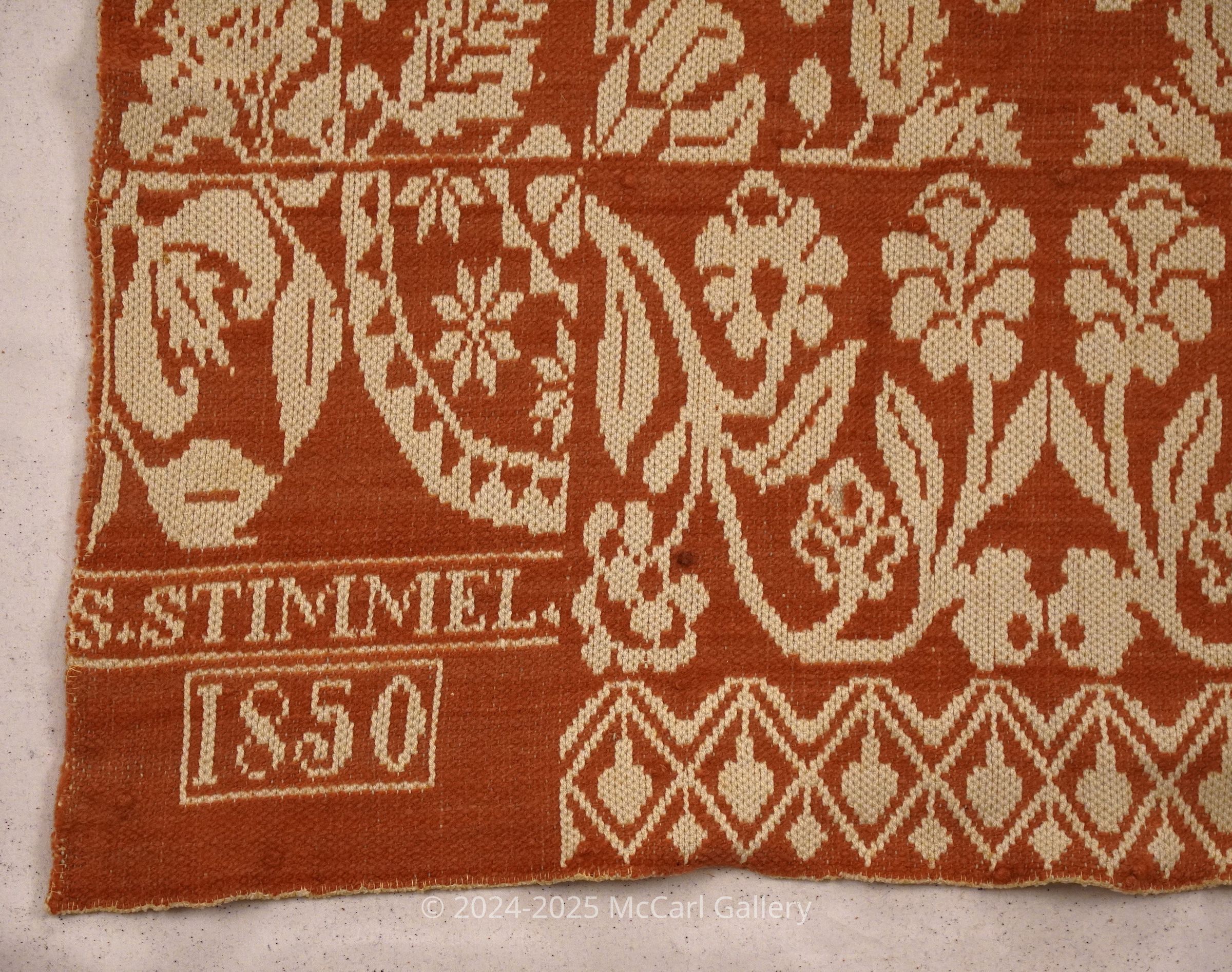 Red and natural figured Tied Beiderwand 2:1 coverlet; one panel. Border on left and bottom; no fringe.Collection