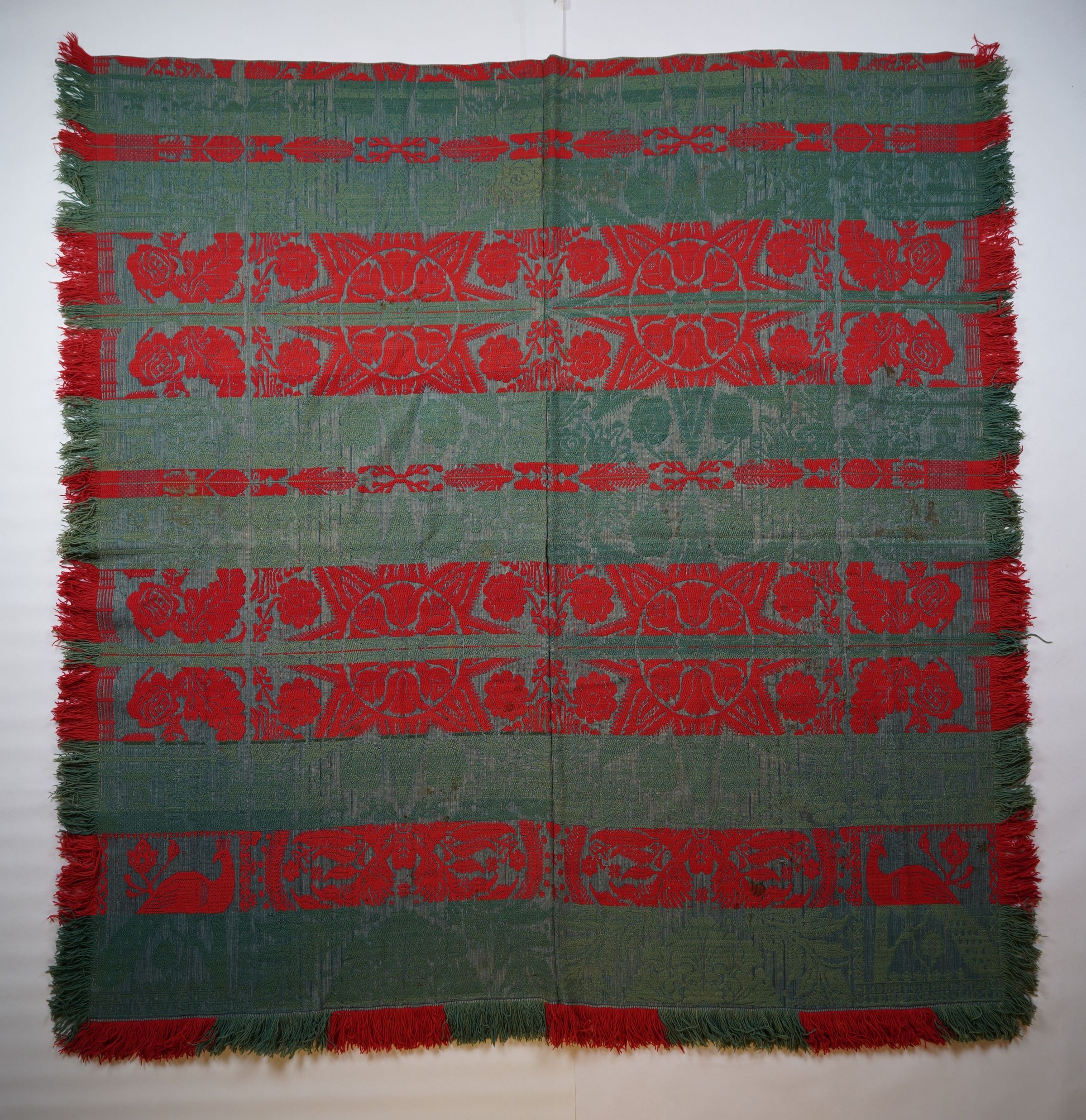 Teal, blue, and red figured tied half doublecloth coverlet with border and fringe on three sides. Tow joined panels. Woven by Henry Stager in Myerstown, Jackson Twp., Lebanon Co., Pennsylvania.Collection