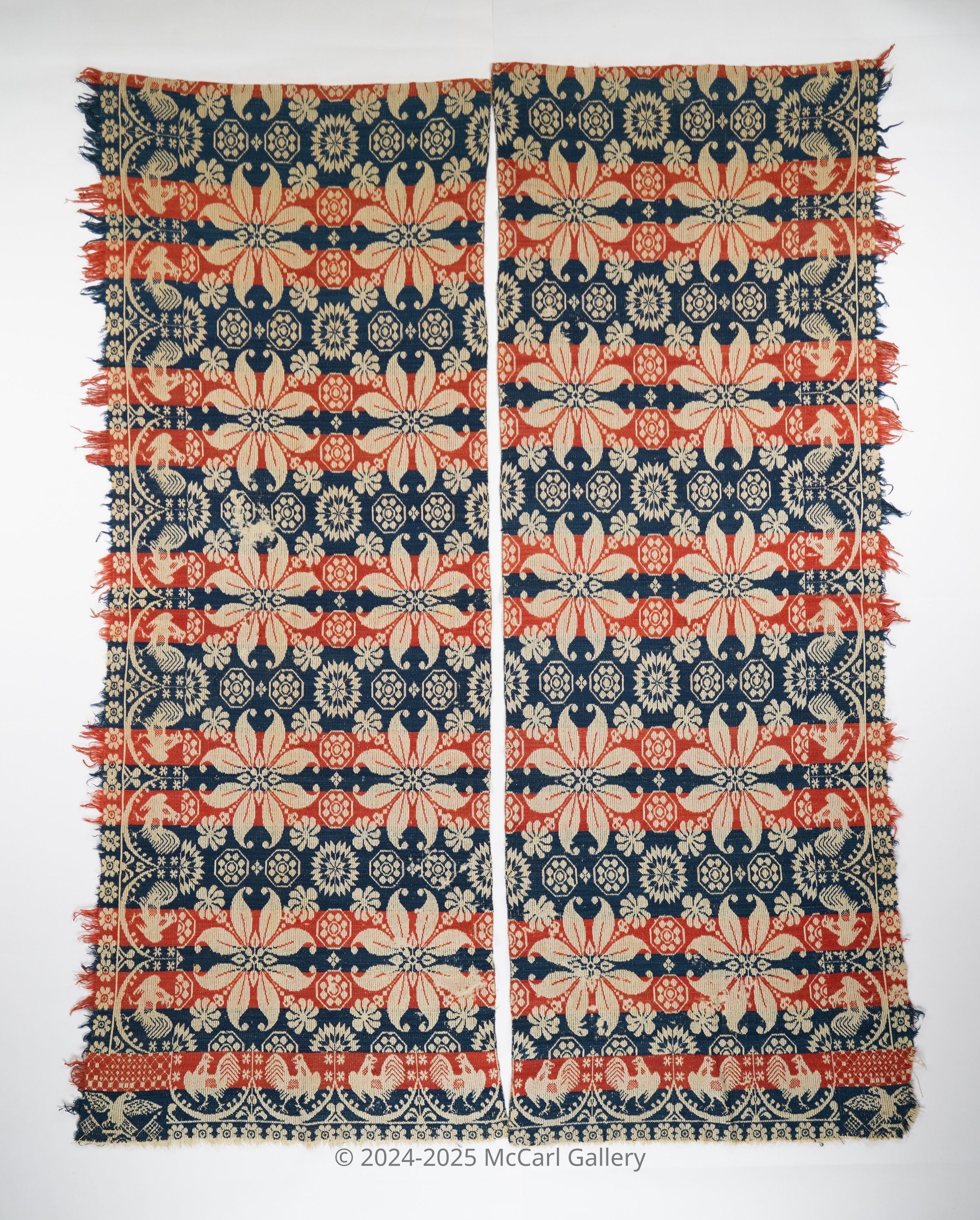 Red, navy, and natural figured tied beiderwand coverlet with border on three sides and fringe on two sides. Two separated panels.Collection