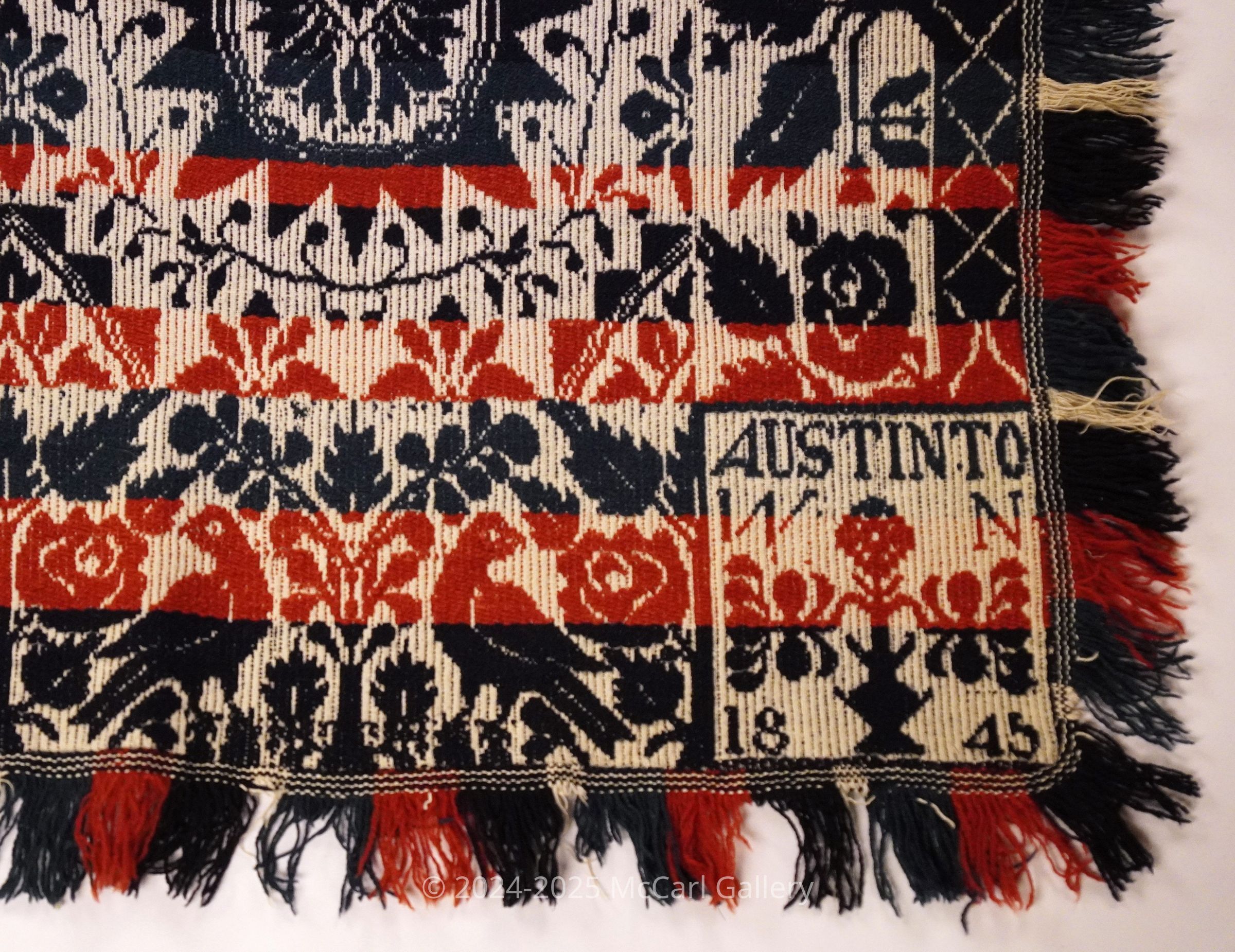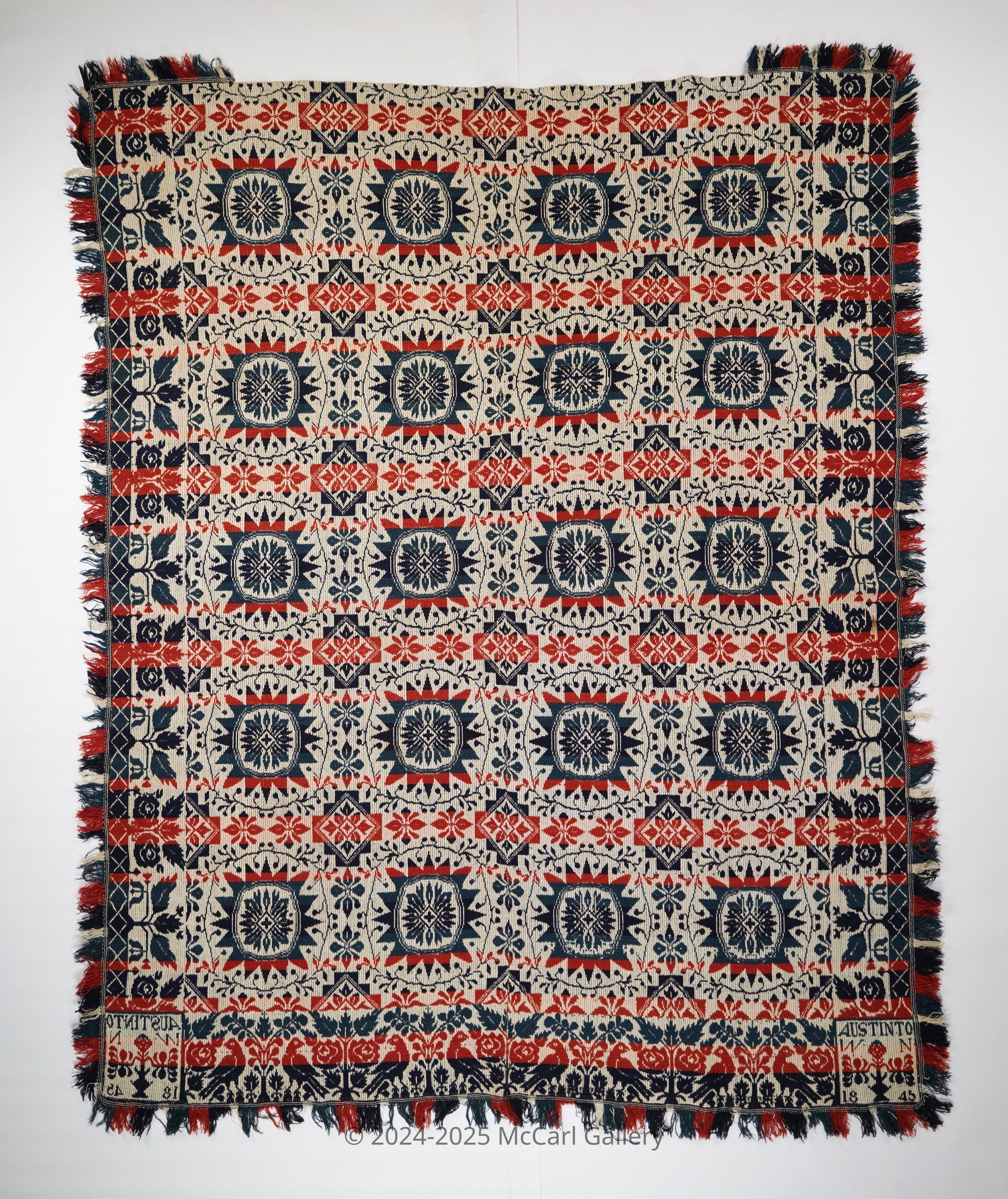 Red, navy, and natural figured tied beiderwand coverlet with applied fringe on three sides and a third of the top side. Border on three sides. Two joined panels. Woven in Austintown (Township), Mahoning Co., Ohio in 1845.Collection