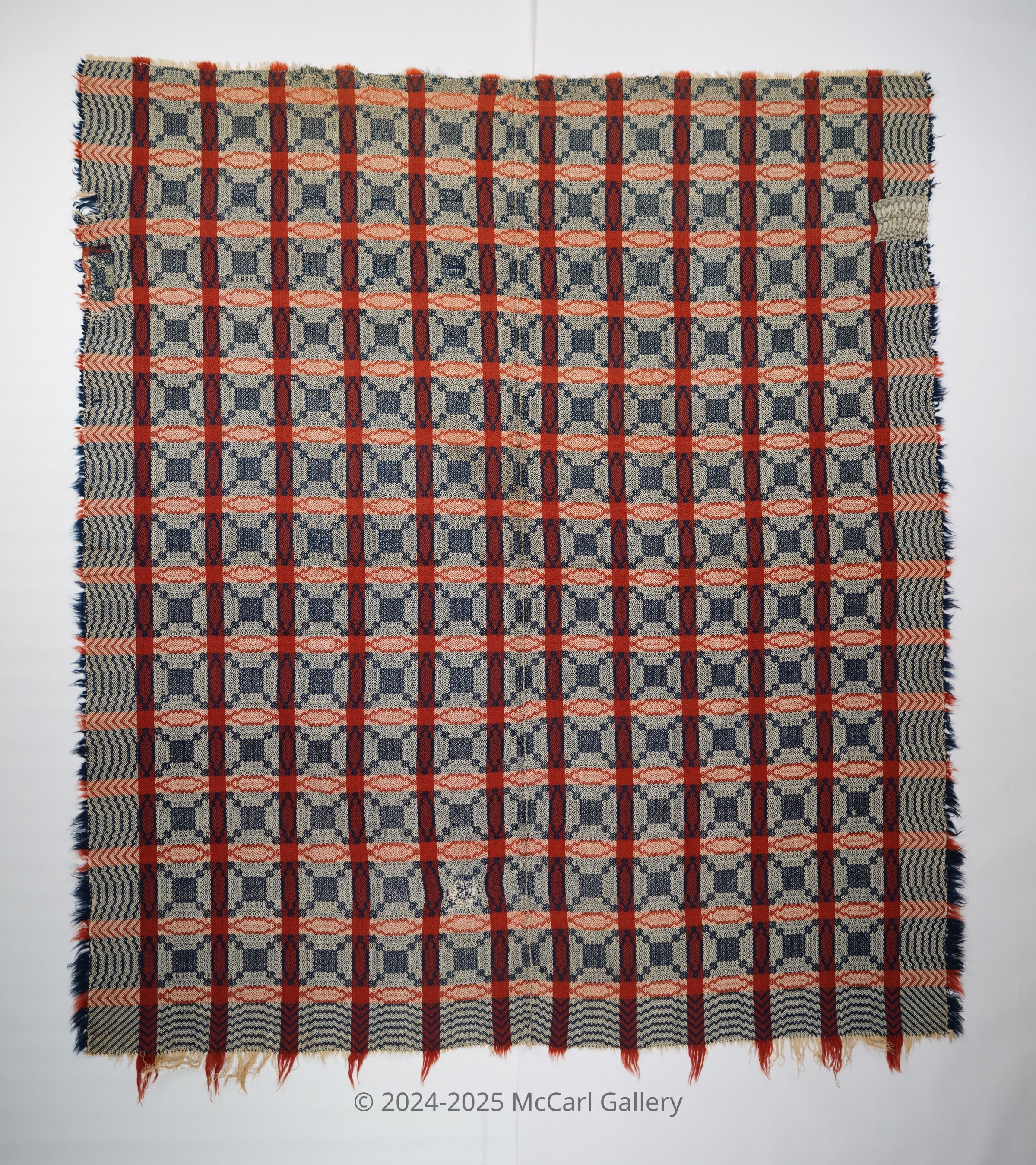 Red, navy, and natural geometric gebrochene coverlet with border on three sides. Two joined panels.