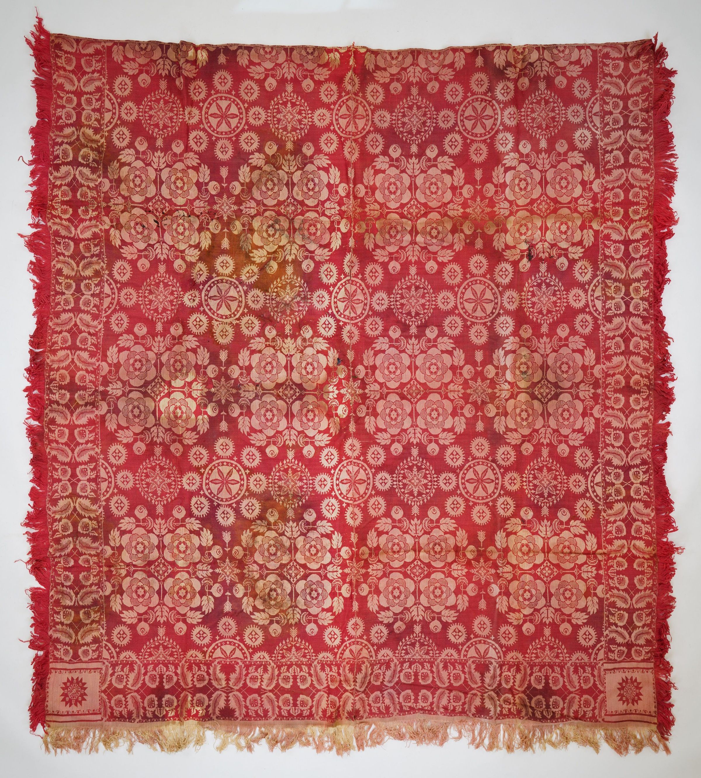 Red and natural figured tied Beidwerwand coverlet; two panels joined by center seam, self-fringe on three sides, feather border on three sides, rosette corner block, unsigned, floral medallions and hex signs in centerfield.Collection