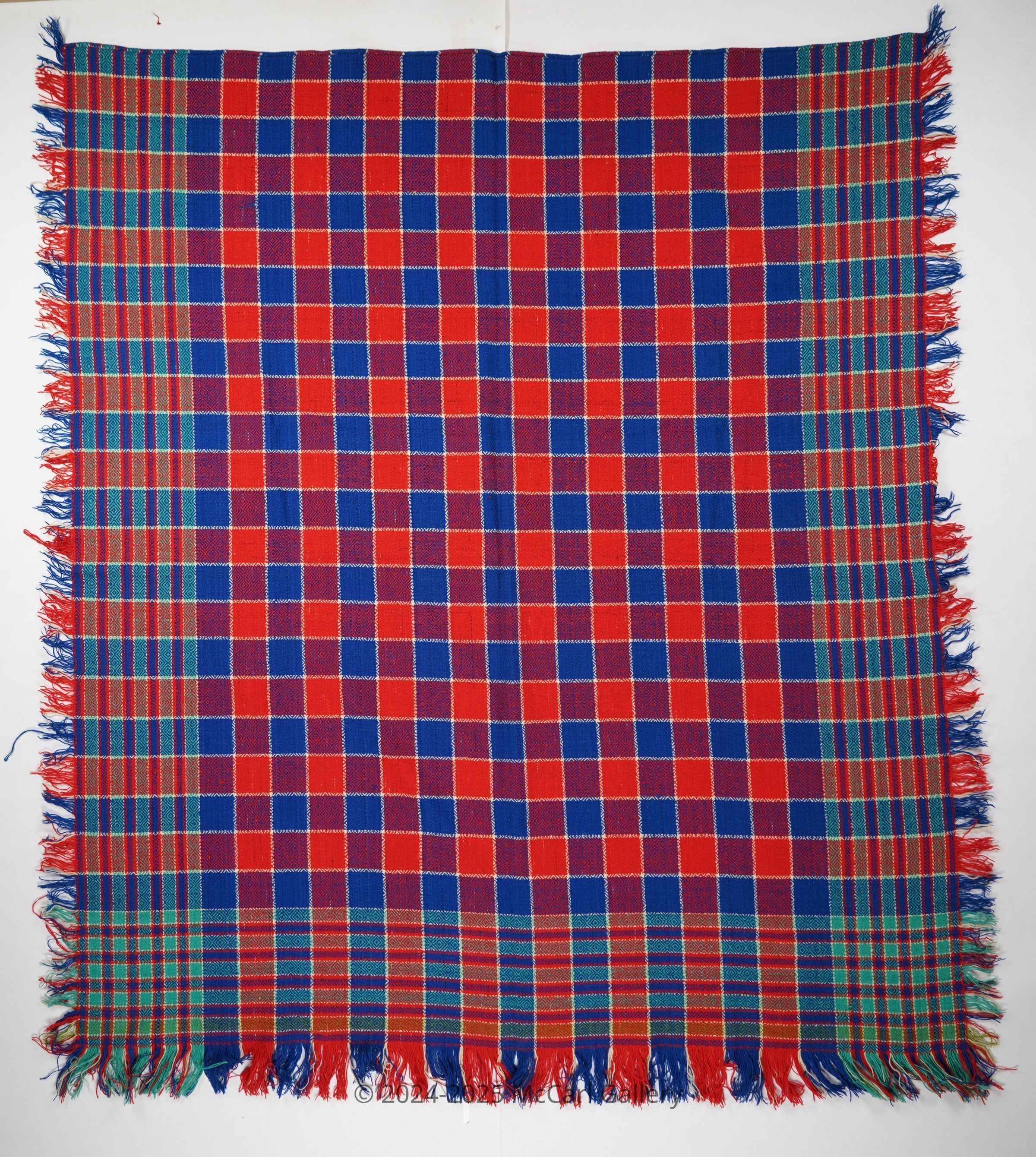 Reproduction red, green, light blue, blue, and natural geometric goose-eye twill coverlet with border and self-fringe on three sides. Two joined panels.Collection