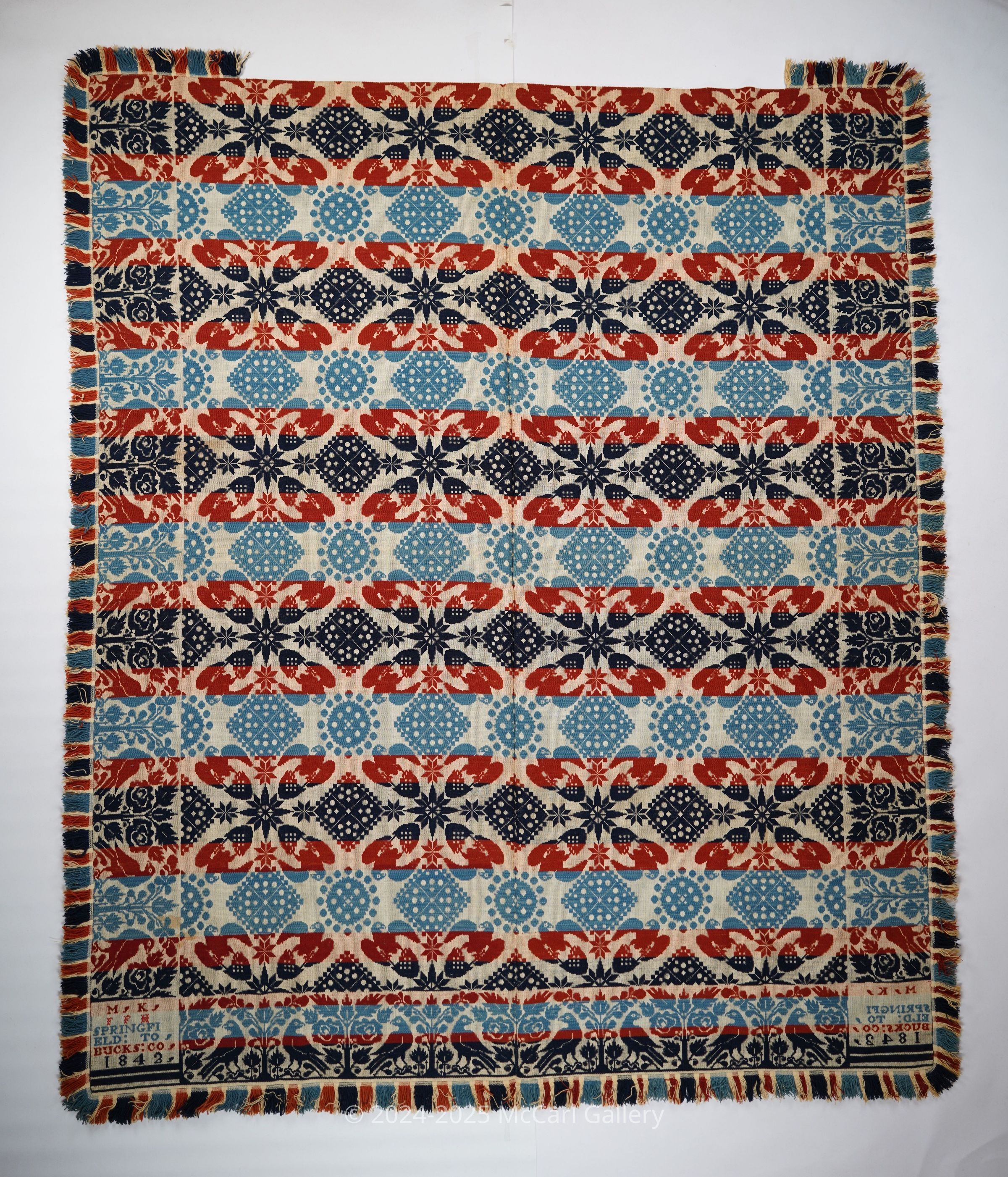 Red, blue, navy, and natural coverlet with border on three sides and applied fringe on four sides. Two joined panels. Woven for F. F. H. by Michael Kaufman in Springfield Twp., Bucks Co., Pennsylvania in 1842.Collection