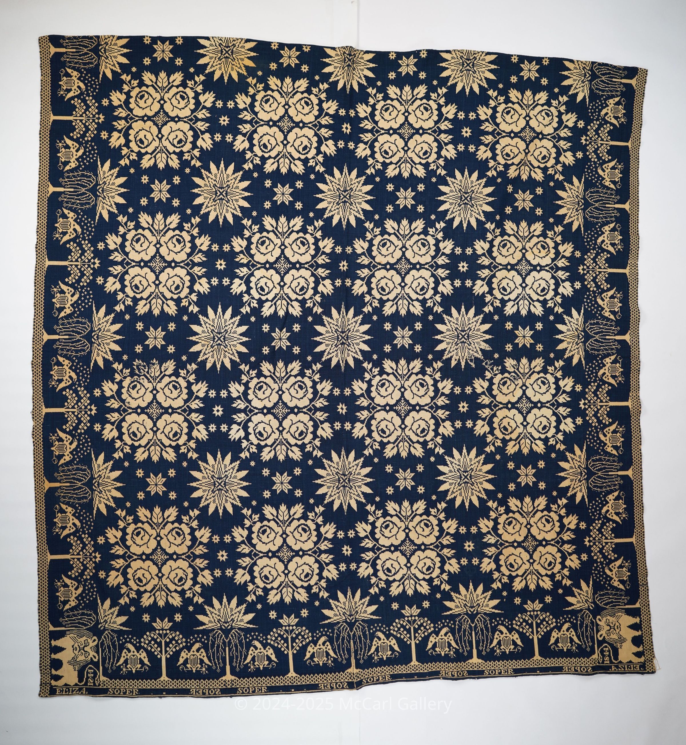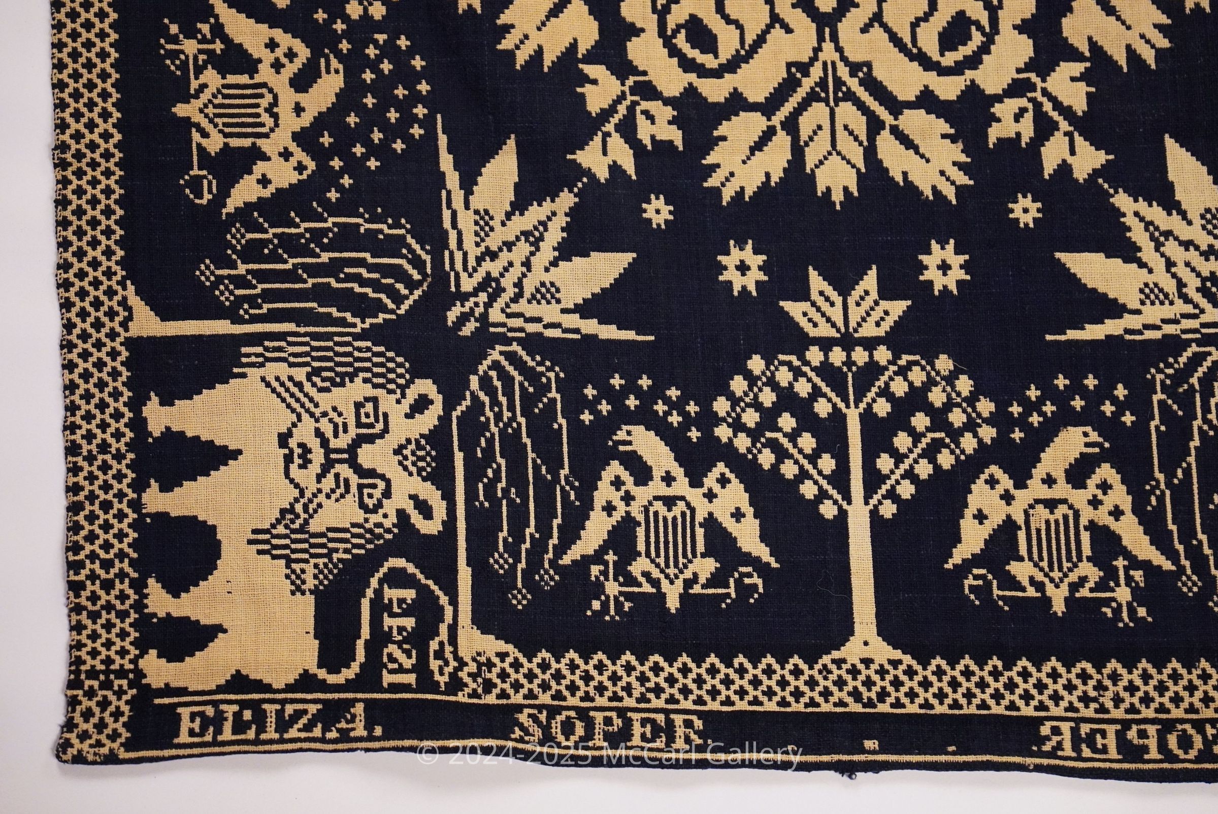 Navy and natural figured double weave coverlet with federal eagle and tree border on three sides. Two joined panels. Woven for Eliza Soper by Harry Tyler in 1844.Collection
