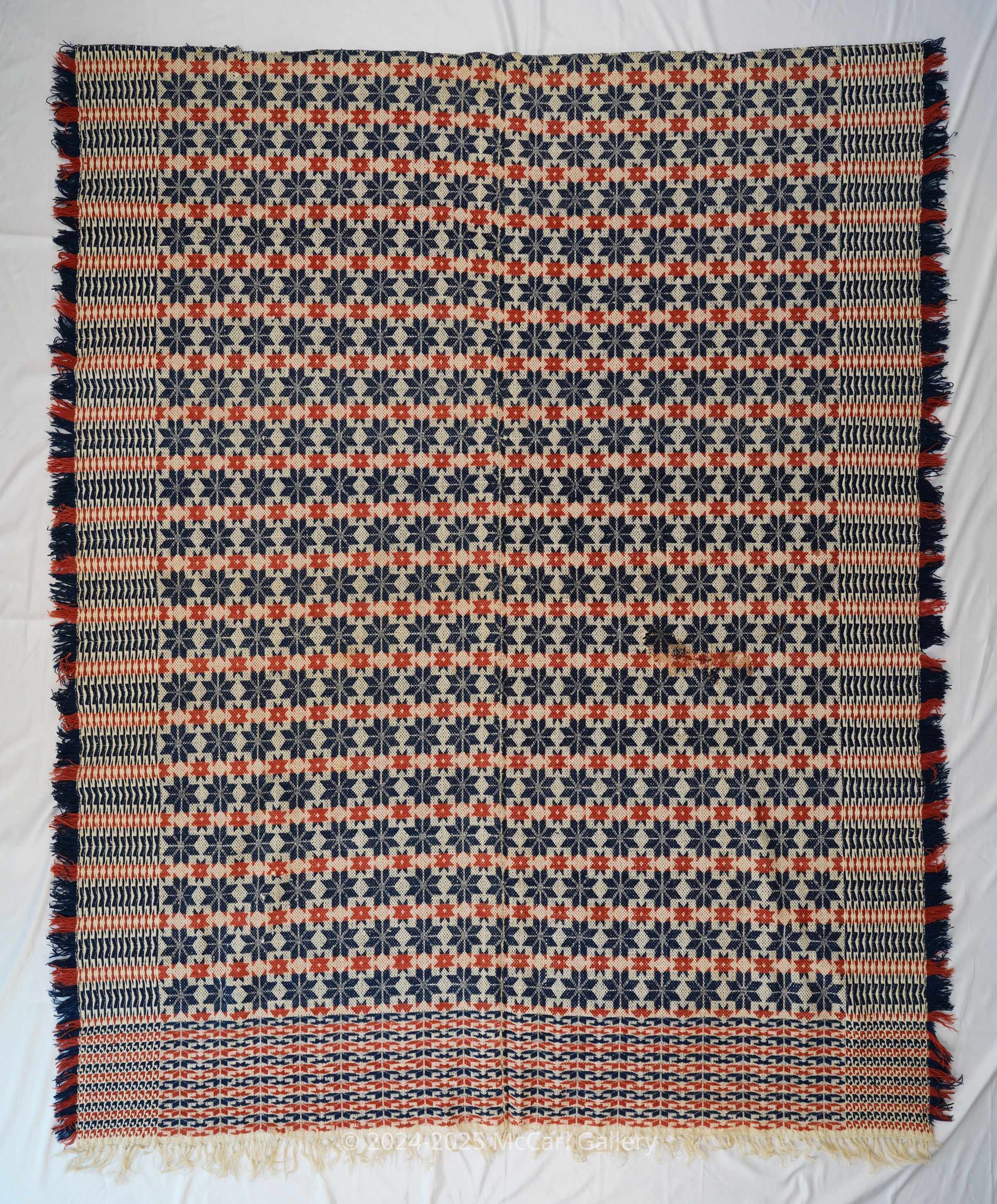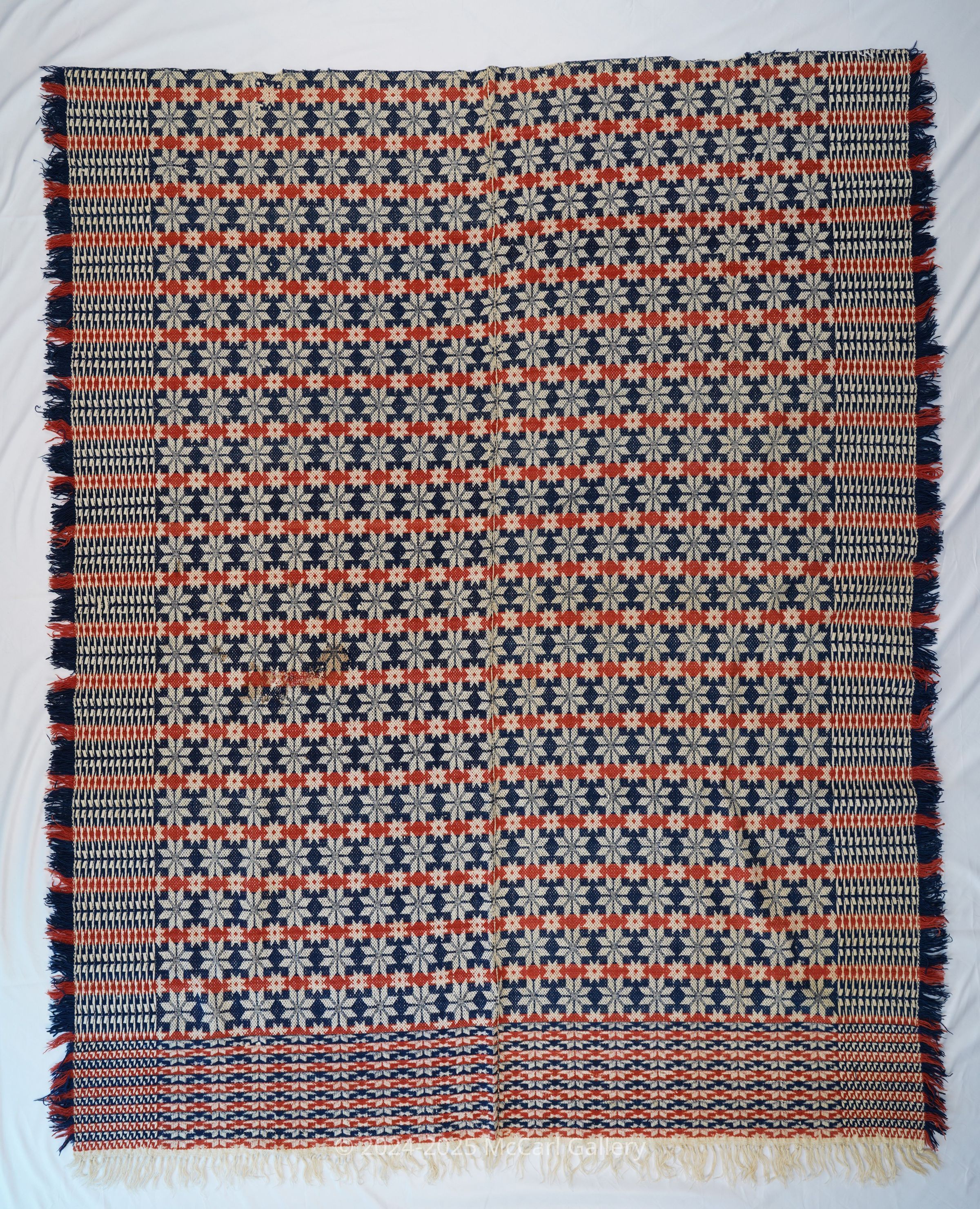 Navy, red and natural starwork coverlet; geometric big & little stars pattern. Two panels joined. Border and self-fringe on three sides.