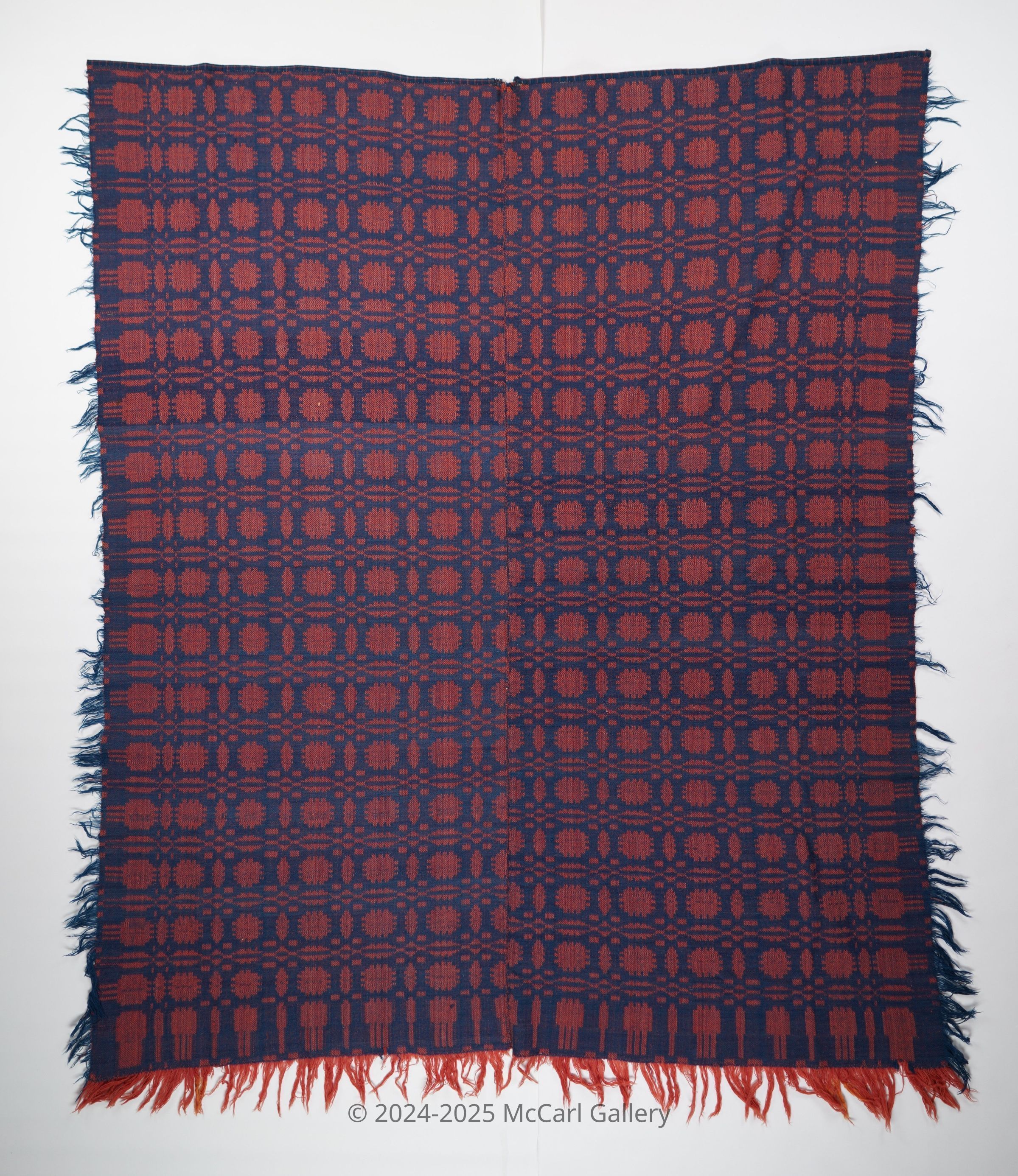 Navy and red geometric block twill coverlet with border and self-fringe on three sides. Two joined panels.