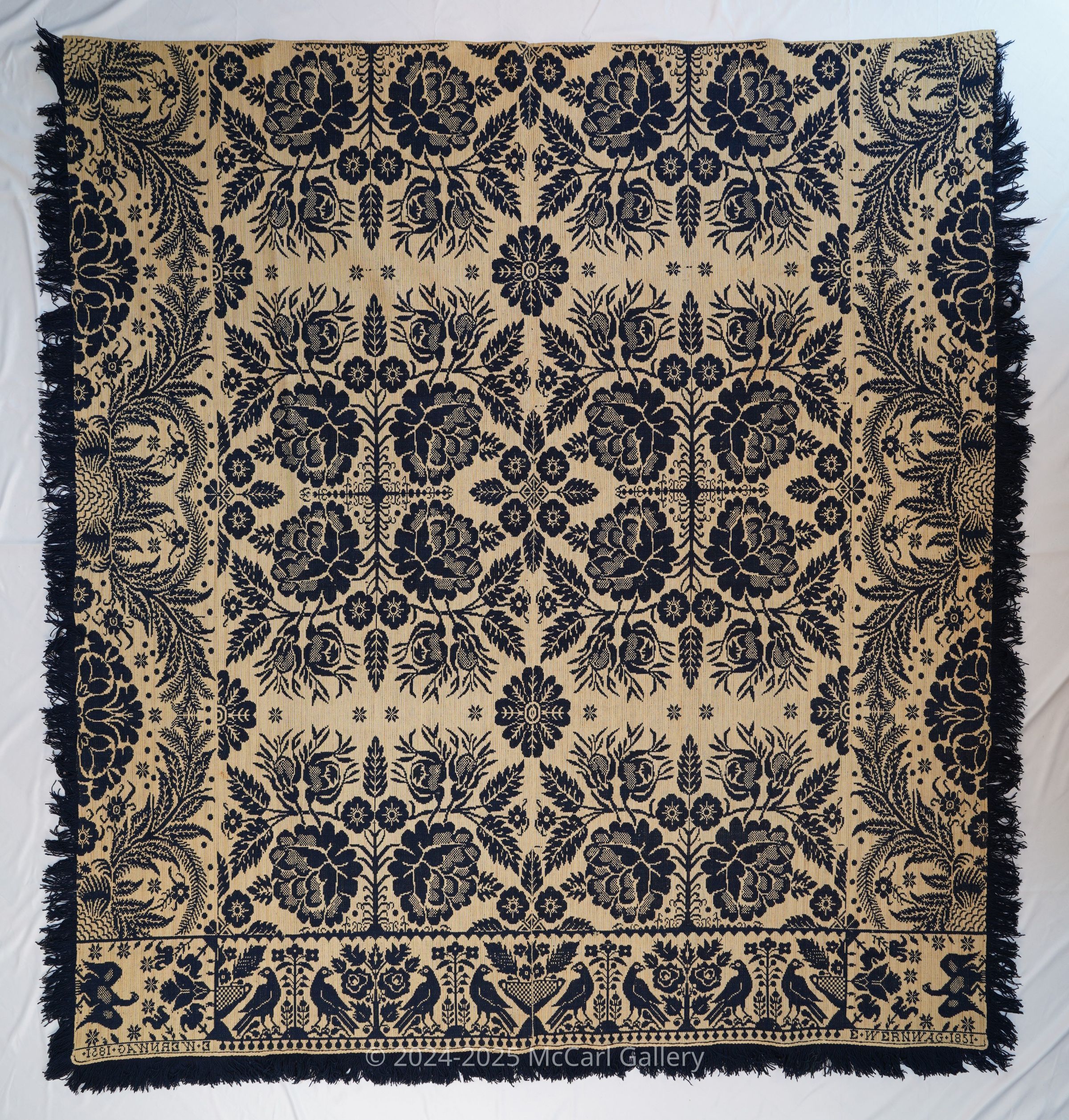 Natural and navy figured double weave coverlet; two panels joined by a center seam. Border and fringe on three sides.Collection