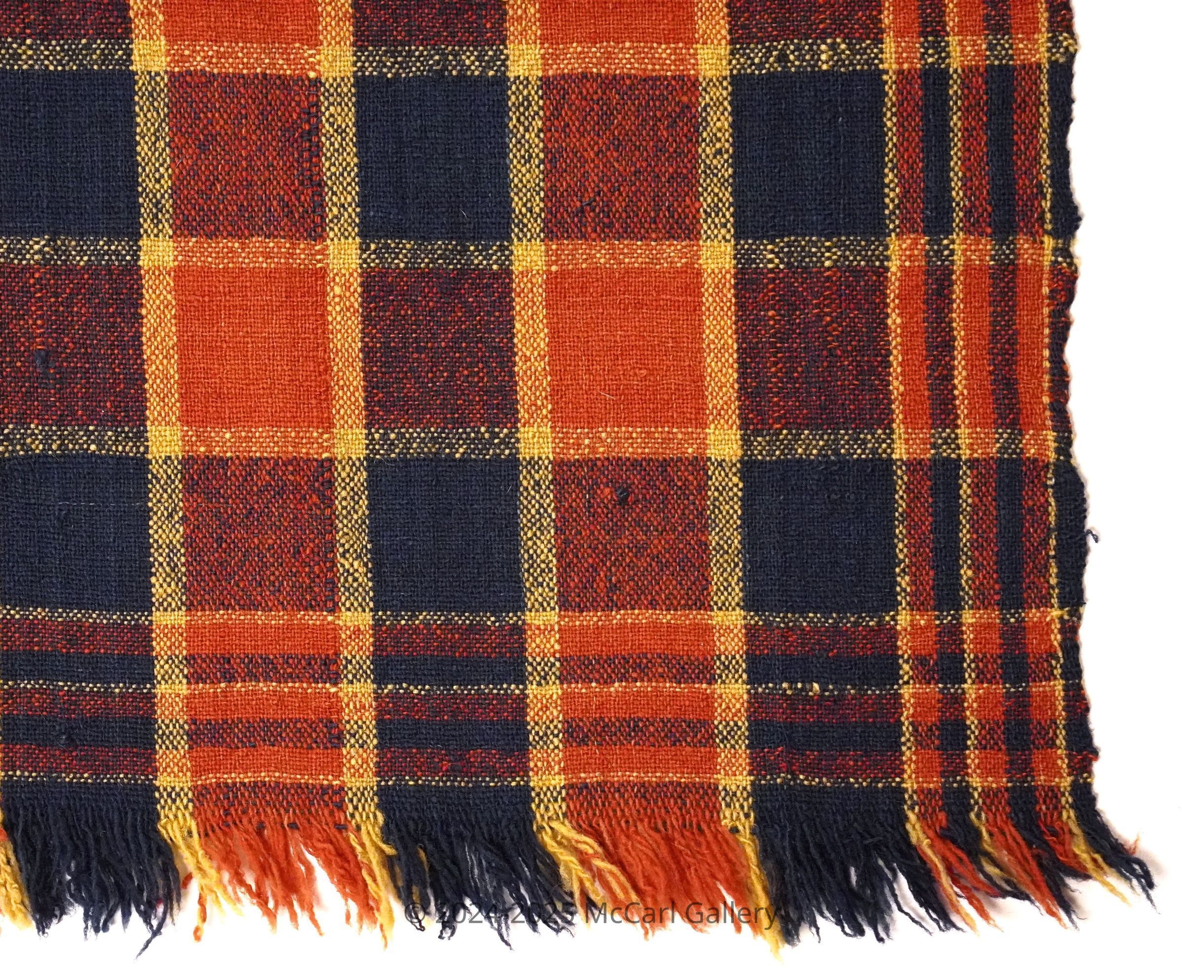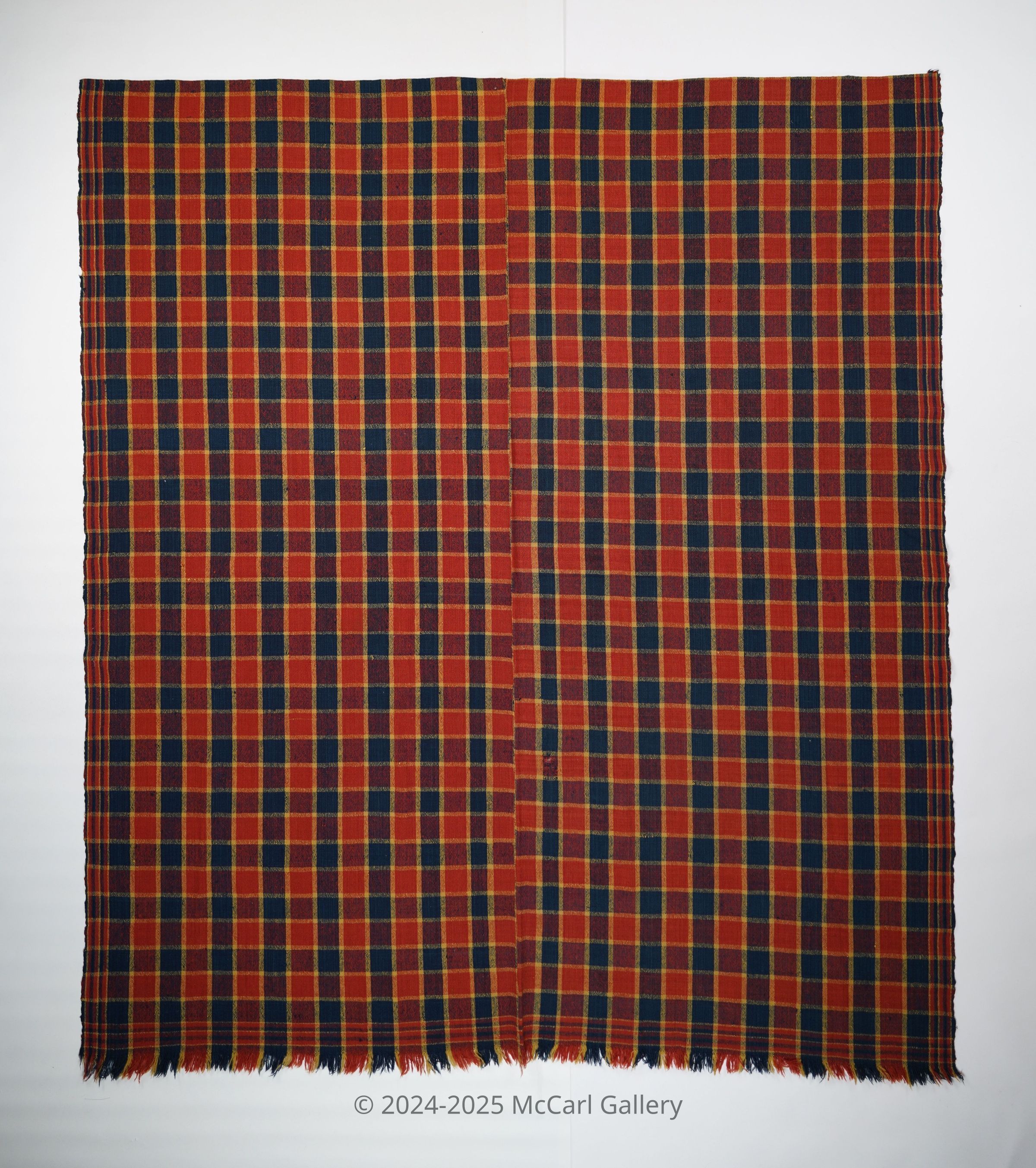 Red, navy, and yellow geometric plainweave coverlet with self-fringe along bottom and border on three sides. Two joined panels.Collection