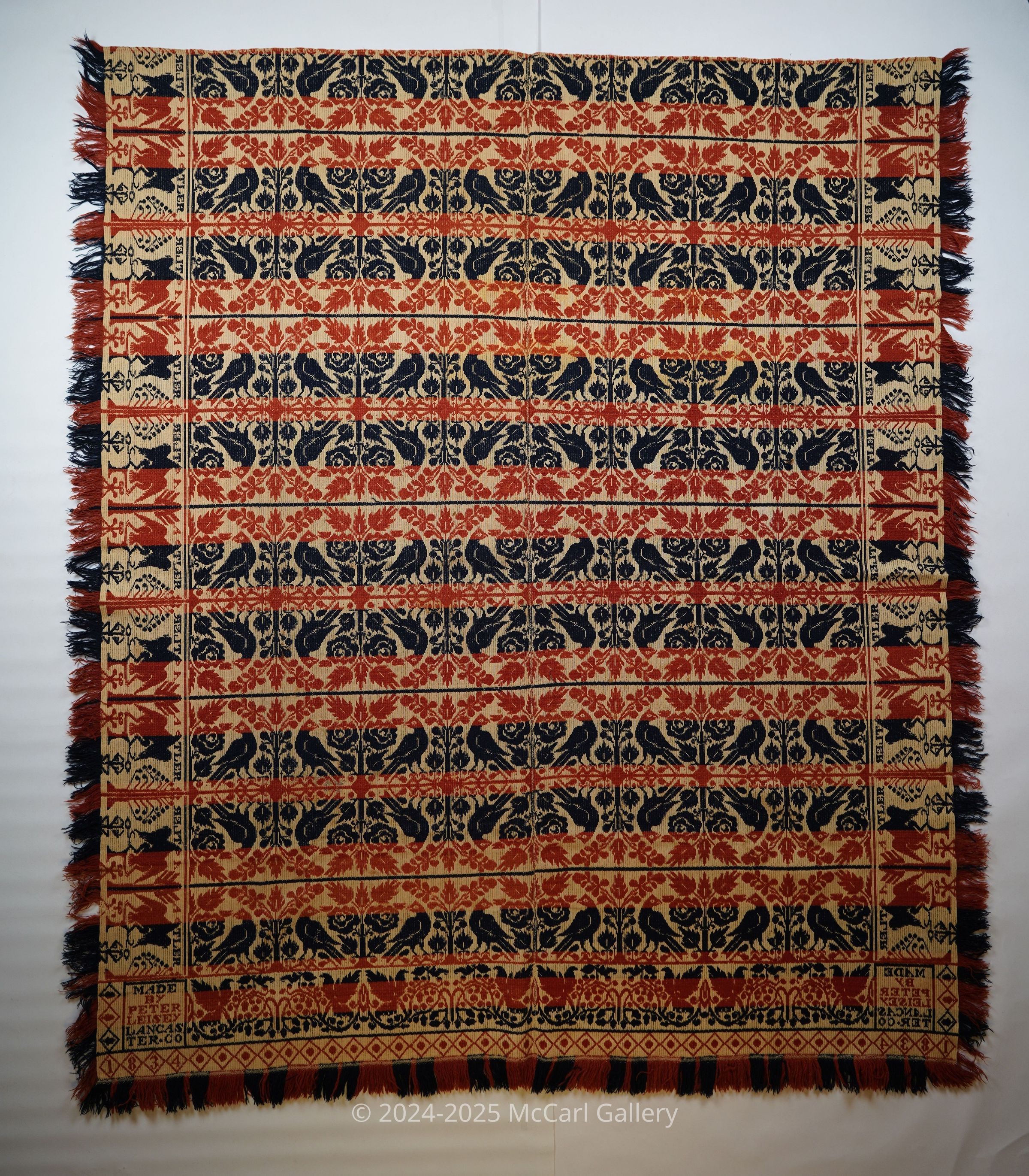 Red, navy, and natural figured tied half doublecloth coverlet with border and fringe on three sides. Two joined panels. Woven by Peter Leisey in Lancaster Co., Pennsylvania, 1834.Collection
