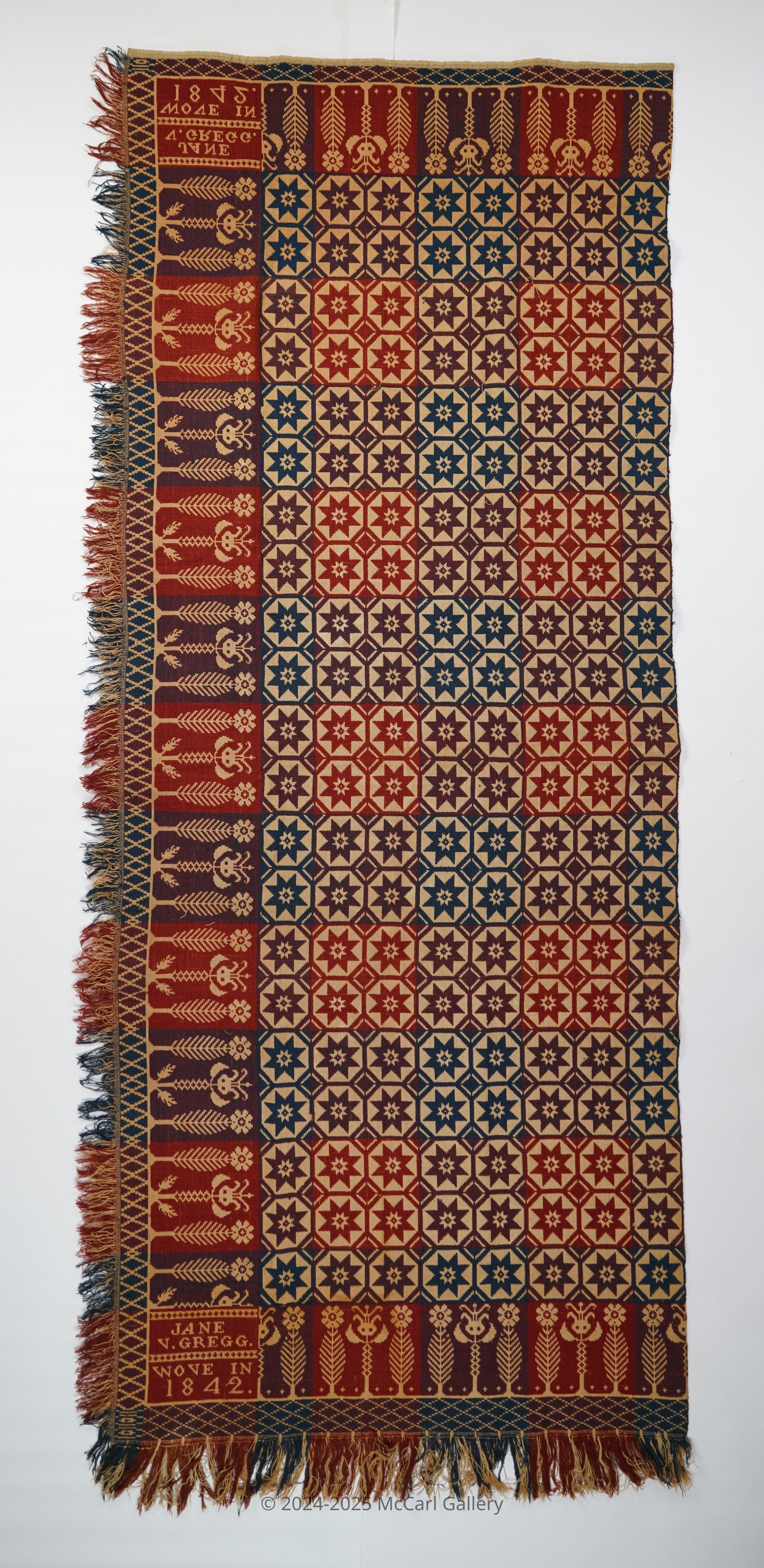Red, navy, and natural figured doublecloth coverlet with border on three sides and self-fringe on two sides. One panel. Woven for Jane V. Gregg by John Gamble in 1842 in Pennsylvania.Collection