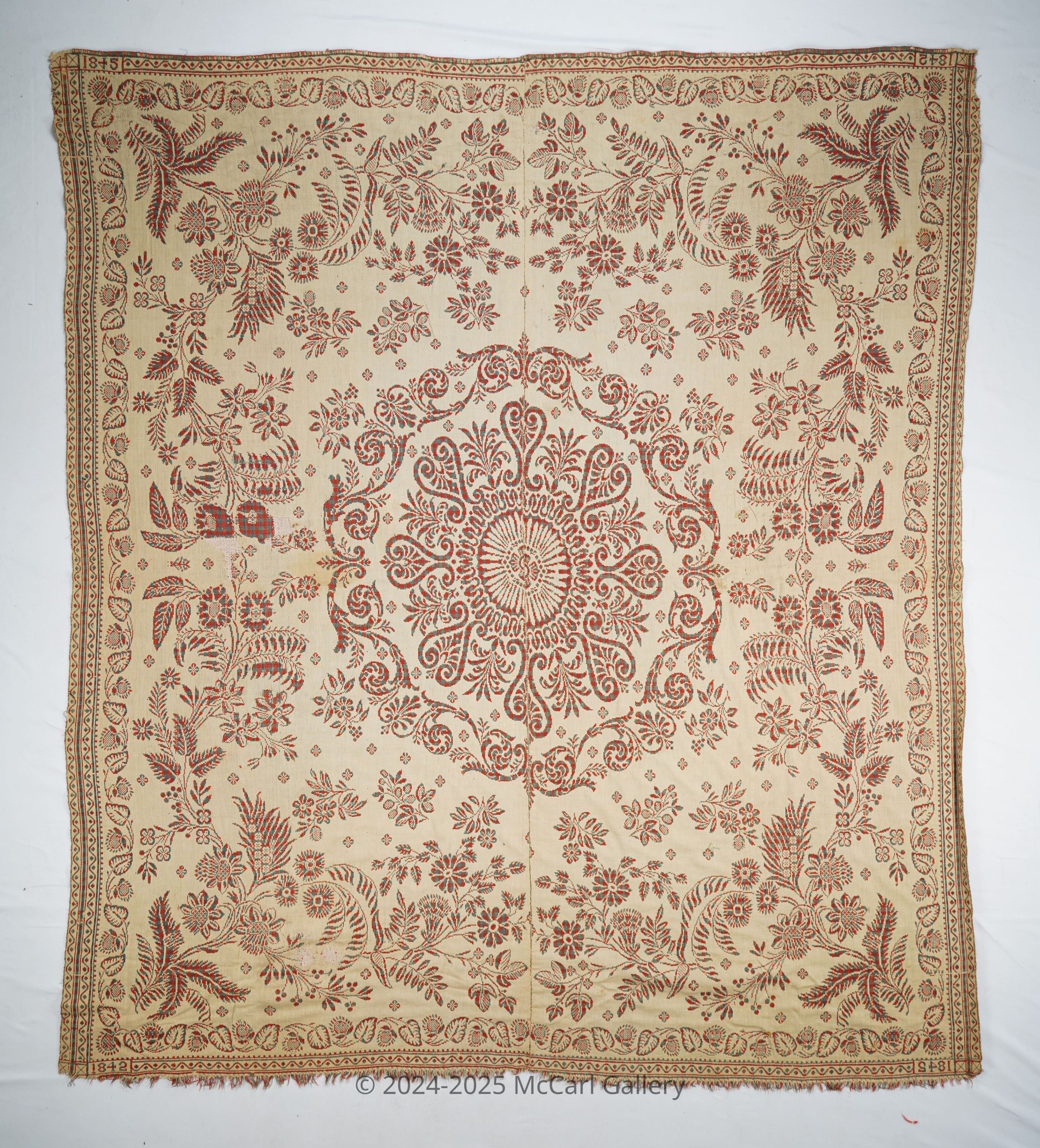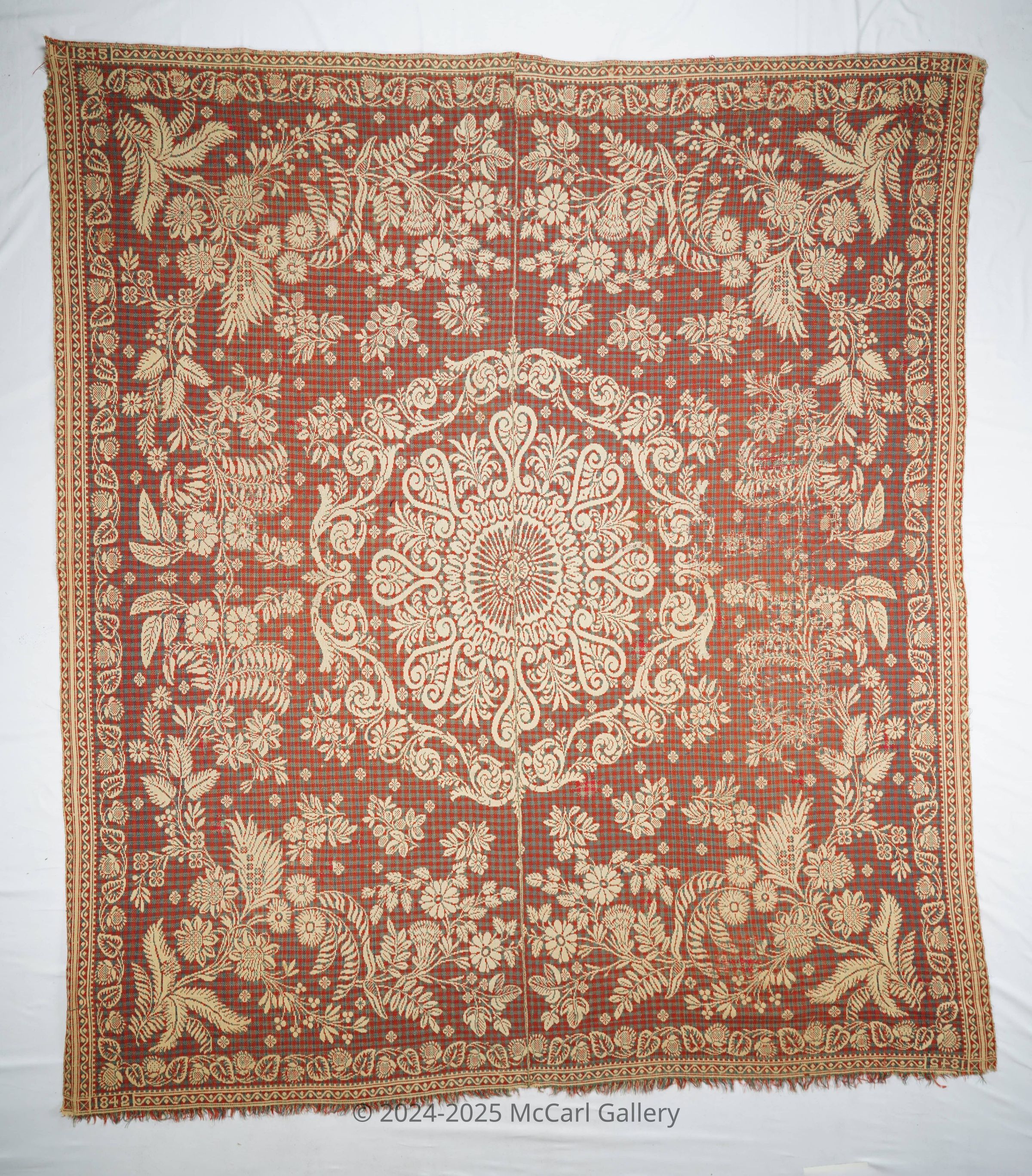 Natural, red, blue, and navy figured double weave coverlet; two panels joined by a center seam. Border on four sides; fringe along bottom.Collection