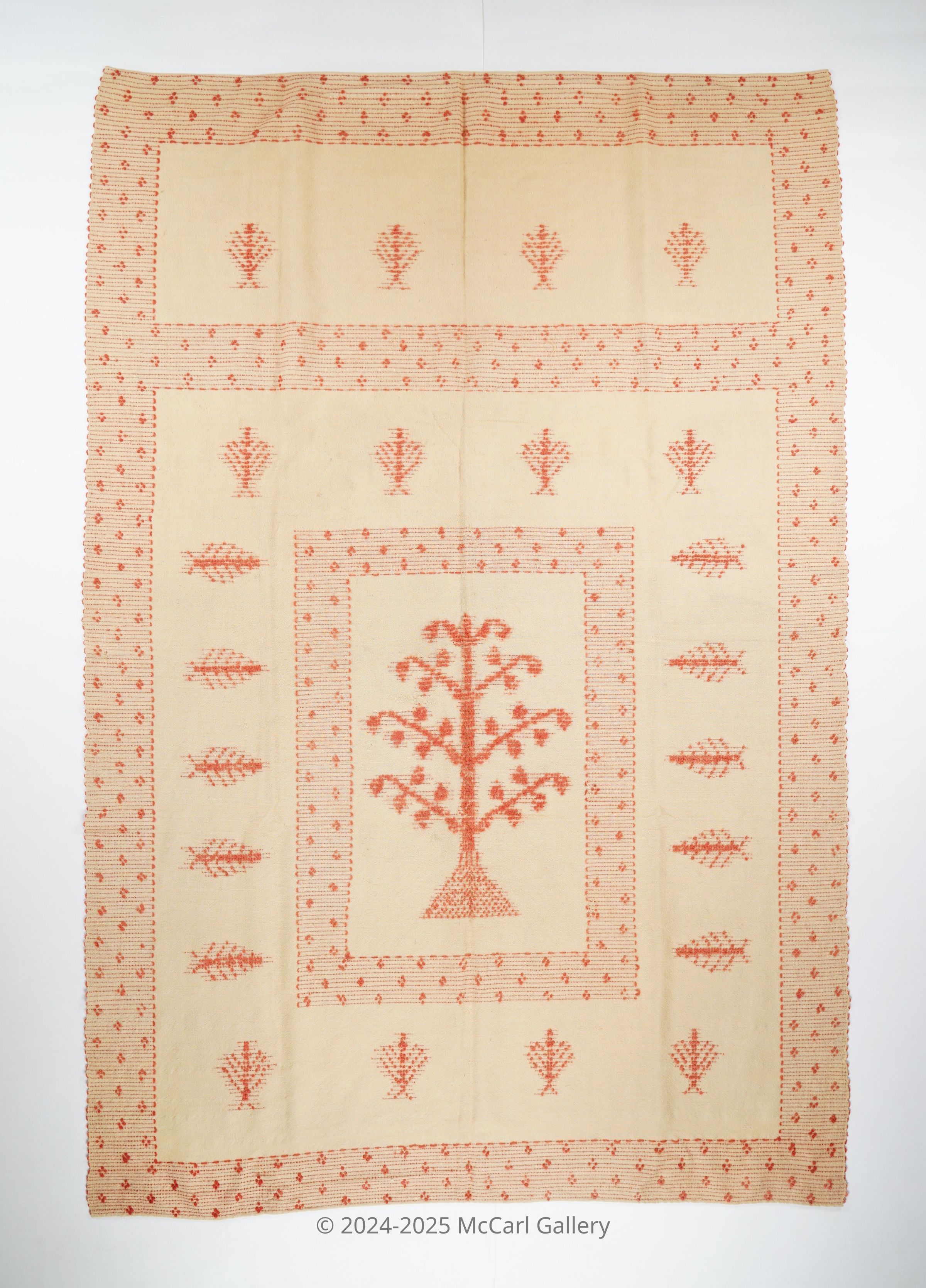 Geometric boutonne coverlet with no fringe. Woven full-width; seamless. Red and undyed wool. Tree centerfield pattern. Unknown weaver. Acadian style, likely made in Canada.Collection