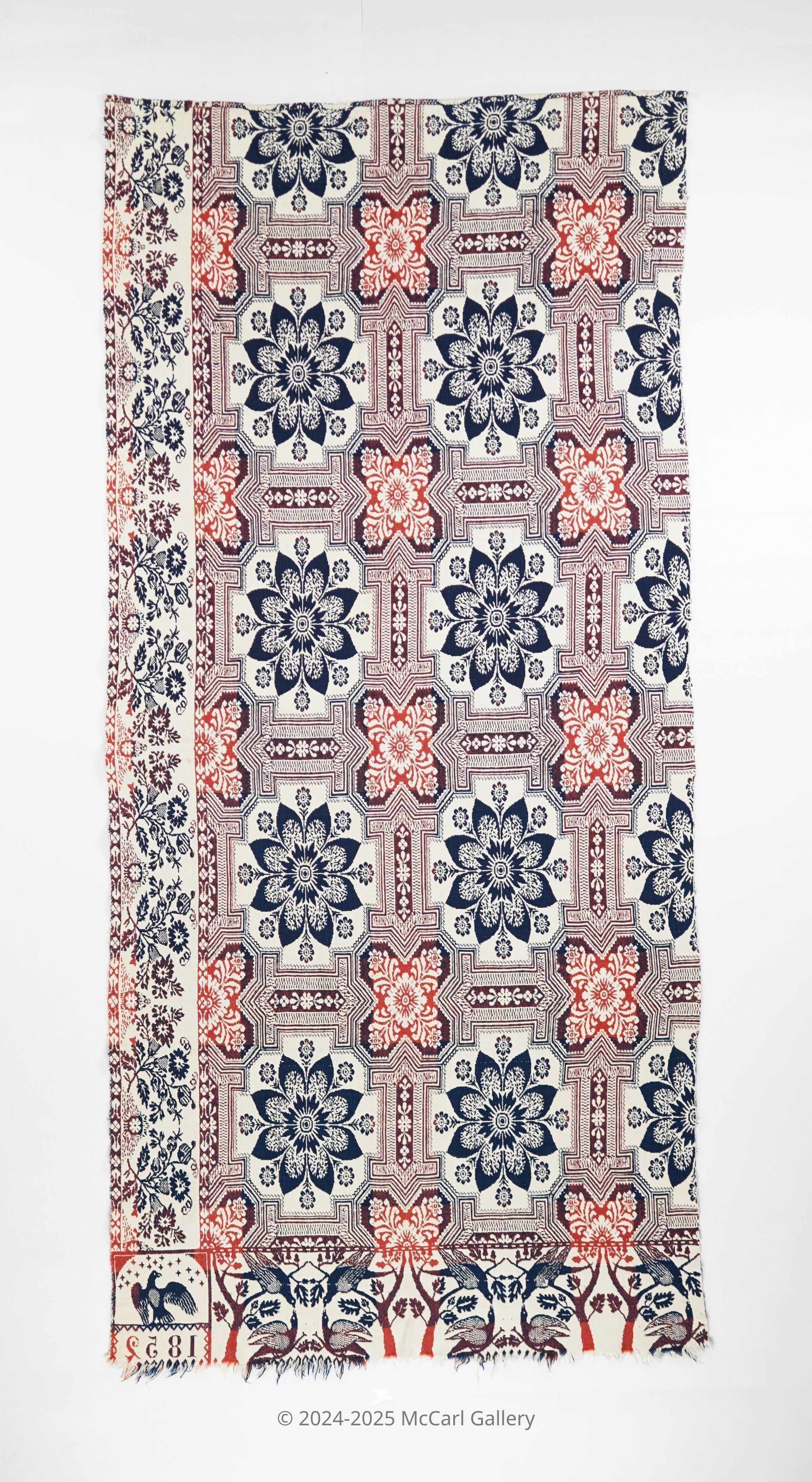 Figured and fancy doubleweave coverlet panel with borders on side and bottom and self-fringe on bottom. Single panel. Navy and red wool with undyed cotton. Floral mosaic centerfield pattern; floral border on side; passenger pigeon border on bottom also known as "lovebirds" or "kissing birds." Woven by Matthew Rattray in 1852 with eagle trademark cornerblock.Collection
