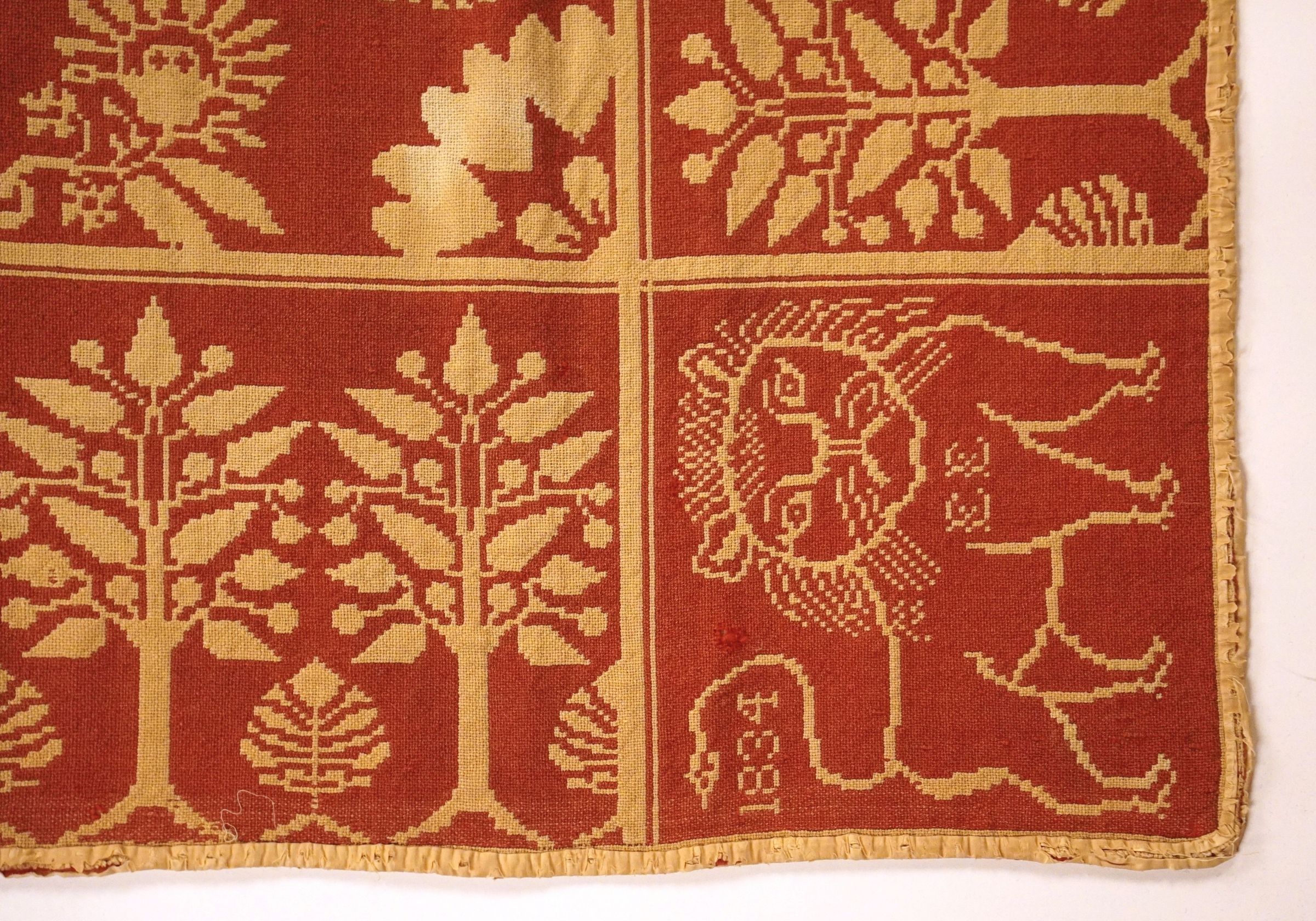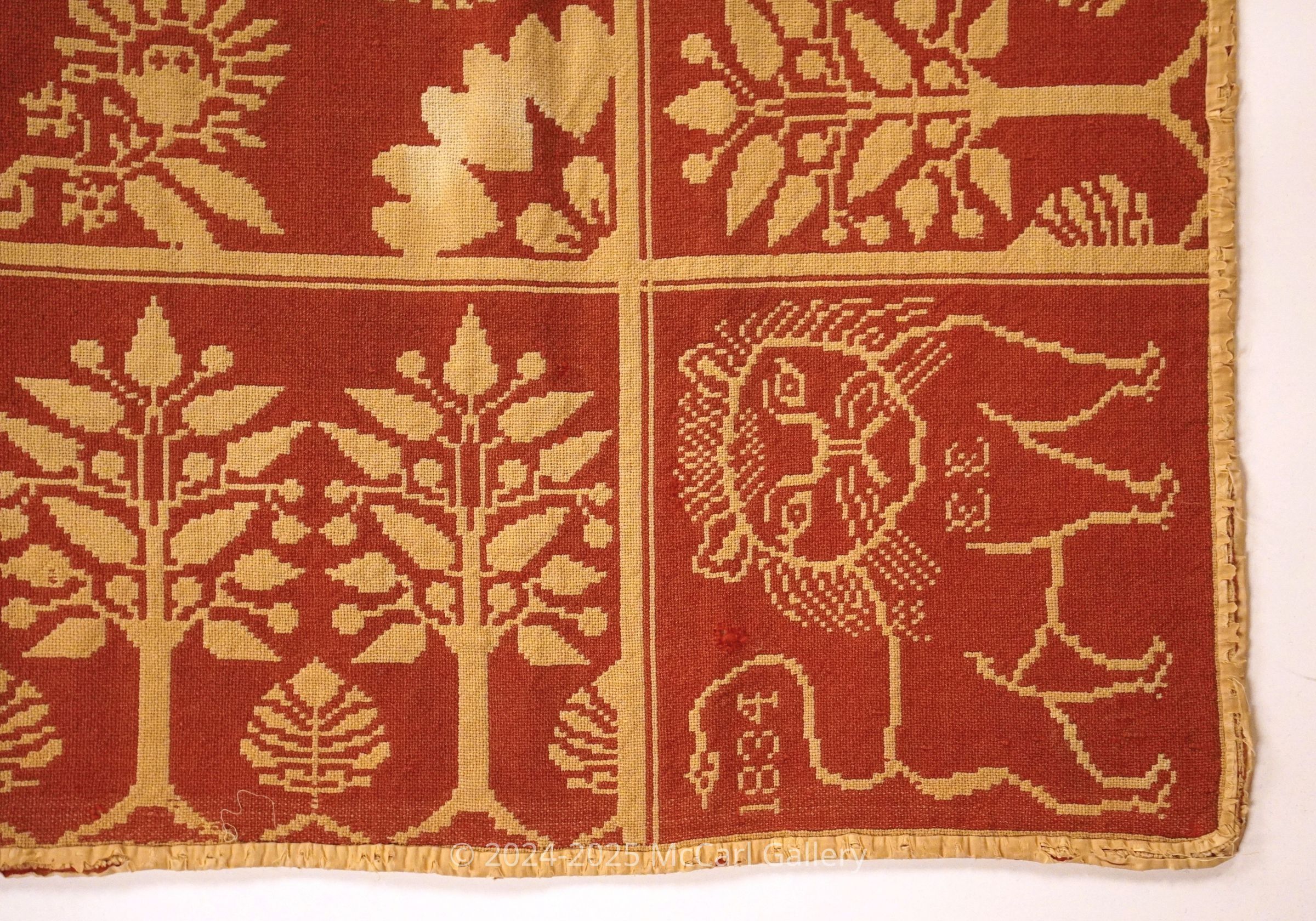 Red and natural figured double weave coverlet with tree border on three sides. Two joined panels. Woven for client with initials E. E. in 1834. Attributed to Harry Tyler.Collection