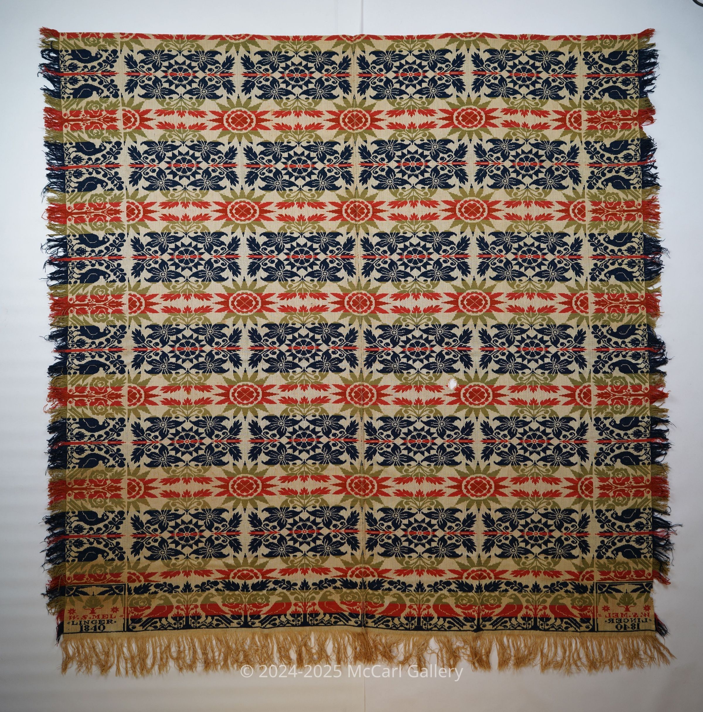Green, red, navy, and natural figured tied half doublecloth coverlet with border and self-fringe on three sides. Two joined panels. Woven by William S. Mellinger in Warwick Twp., Lancaster Co., Pennsylvania in 1840.Collection